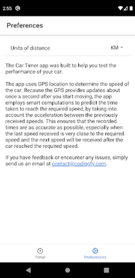 We strongly believe you'll love our Car Timer app but we know we are not perfect, so if you have any suggestions or there's something wrong that you see in the app, we'd love to hear from you at contact@codingfy.com.