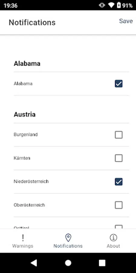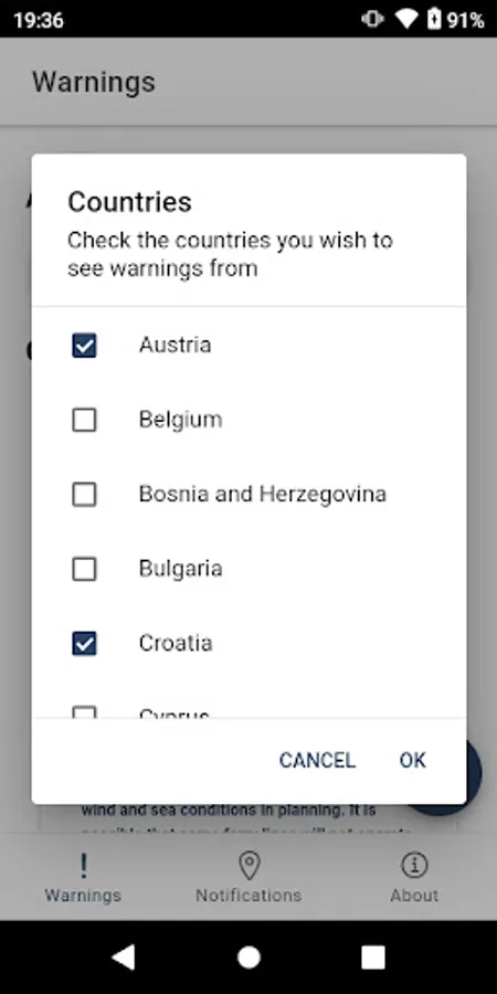 Supported countries are Austria, Bosnia-Herzegovina, Belgium, Bulgaria, Cyprus, Czech Republic, Germany, Denmark, Estonia, Spain, Finland, France, Greece, Croatia, Hungary, Ireland, Iceland, Israel, Italy, Luxemburg, Latvia, North Macedonia, Malta, Moldova, Montenegro, Netherlands, Norway, Poland, Portugal, Romania, Serbia, Sweden, Slovenia, Slovakia, Switzerland, United States, United Kingdom. The warnings are provided by EUMETNET - MeteoAlarm and the National Weather Service (US only).