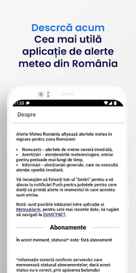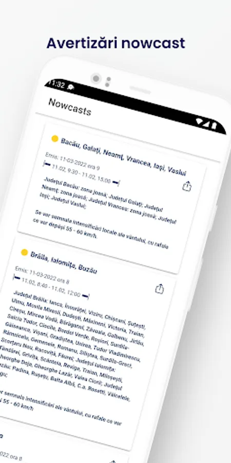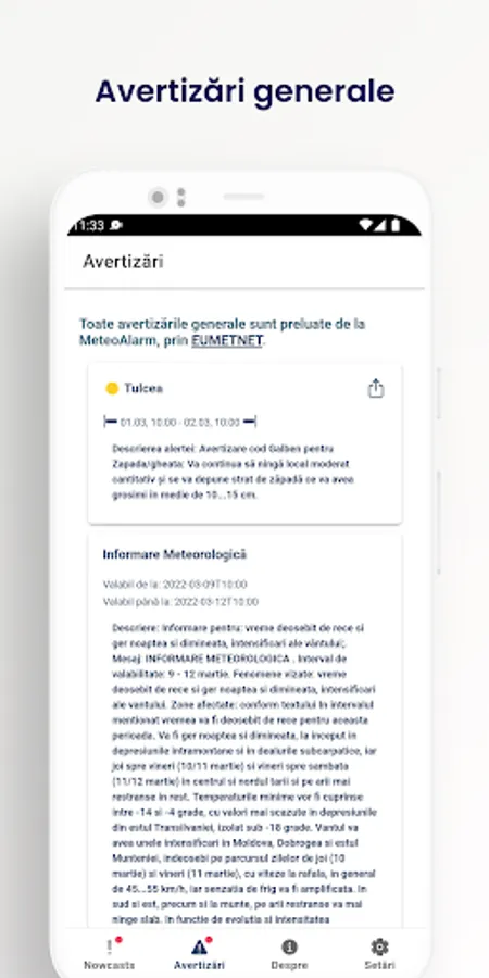 Completely free, you can see all nowcast alerts, general warnings as well as issued weather information. Also, through the "Settings" tab, you can subscribe to push notifications to receive these alerts in real time, valid for all types of alerts*. These warnings can now also be delivered by email** and can be viewed on the map of Romania**.