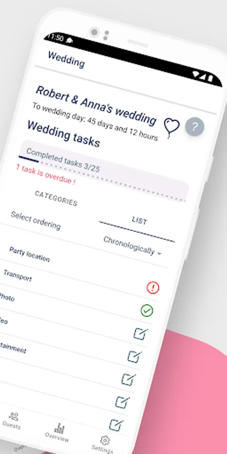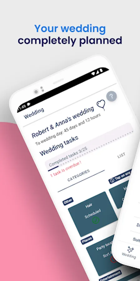 · Fully customisable wedding tasks that include details such as the due date and the amount paid, all grouped in categories