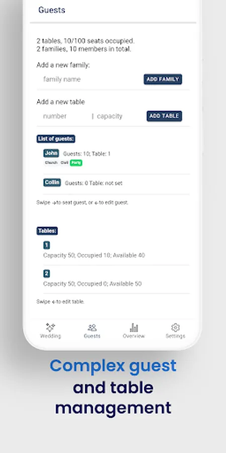 · The list of tables, with capacity so that guests can be seated at tables on the wedding day