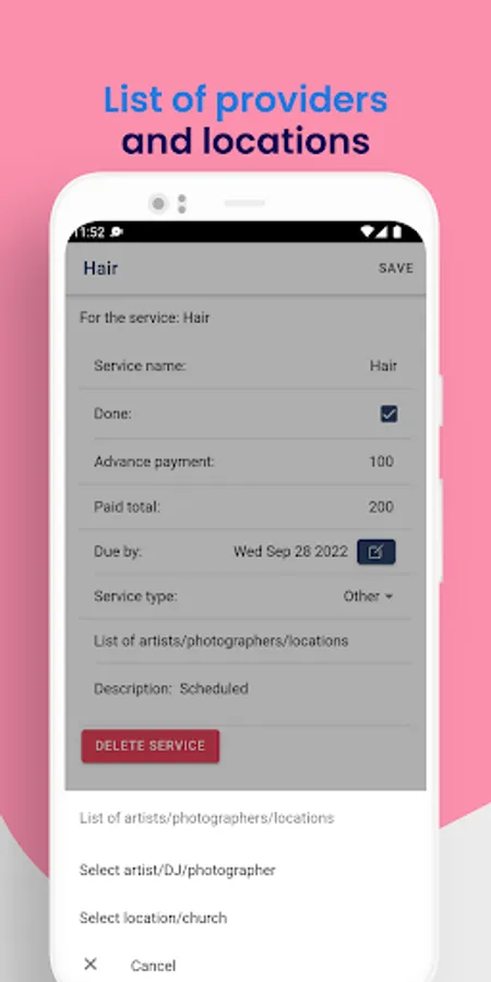 Now, the app lets you view artists, DJs, photographers, venues and churches that you can use for your wedding. Just tap on any task and then you'll be able to see an option to get to all the service providers we have added. Don't worry if you don't yet see an option yet, we're adding new entries to the lists each day!