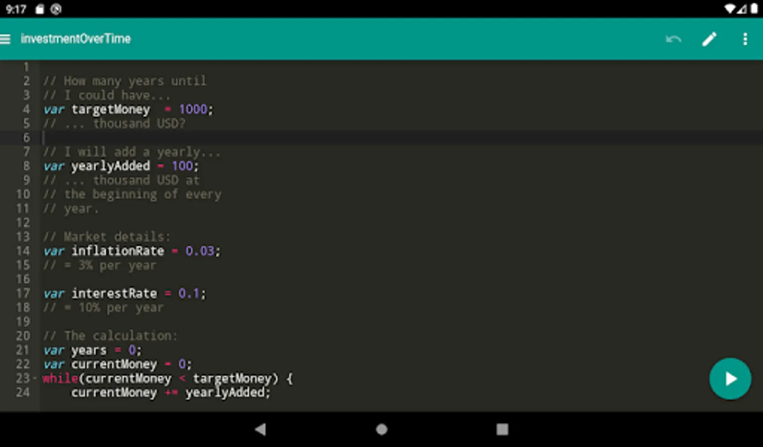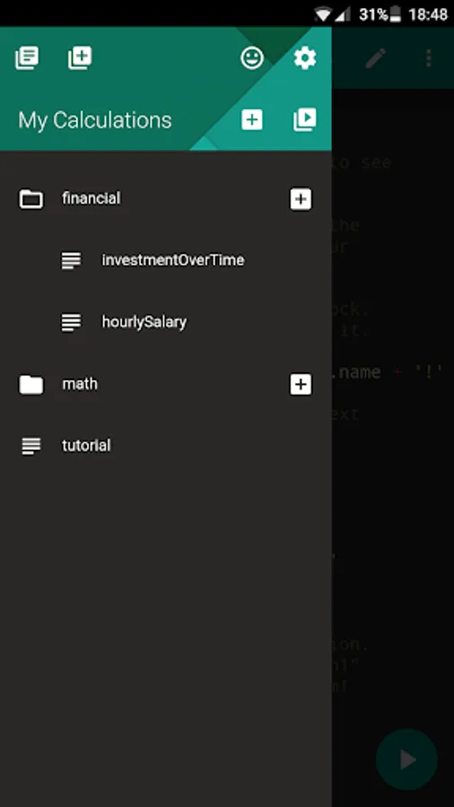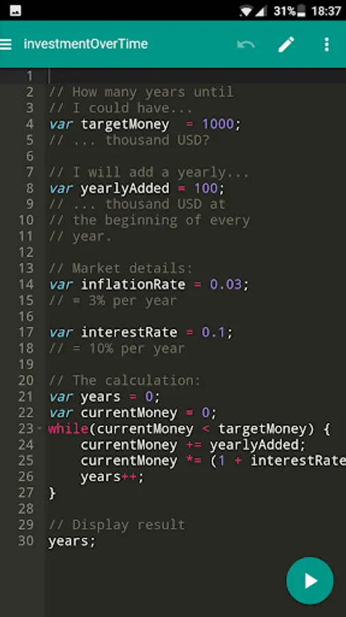 Using this app is a great way to learn the basics of JavaScript, but it is not entirely about teaching, more about using JavaScript to calculate easily. You will find a sample project with a few common calculations at first, and a Help section in the menu. As you learn scripting though, you can use the app more and more to help you with complex questions.