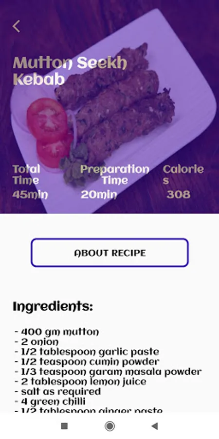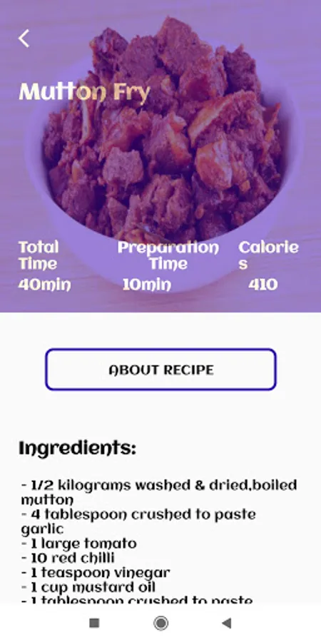 This app is a static not a dynamic.In this app i have just focused on making different types of mutton recipes.Country based traditional recipes have been included in this app.How many calories exist in a mutton recipe that is included in this app.