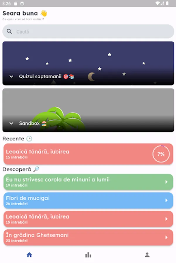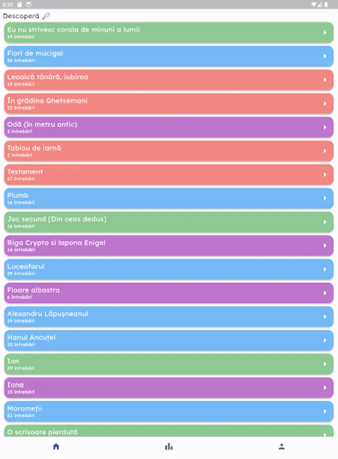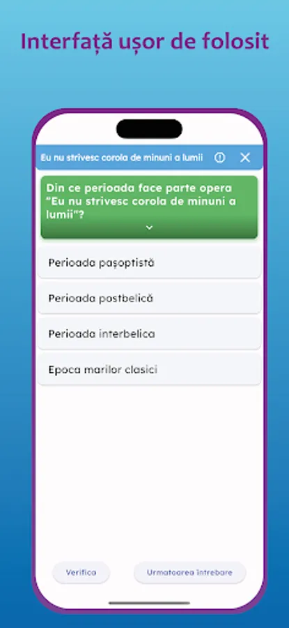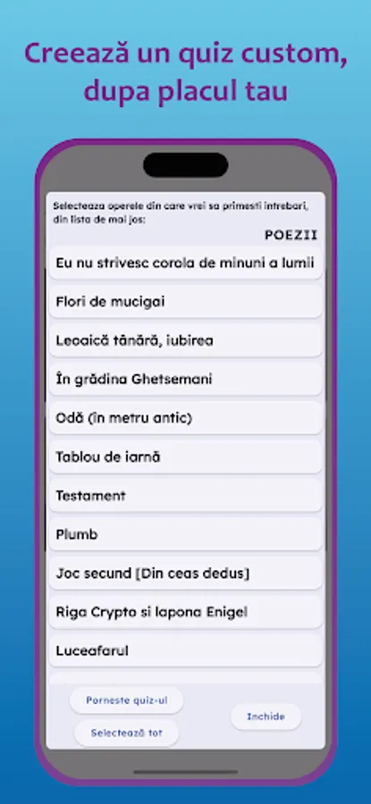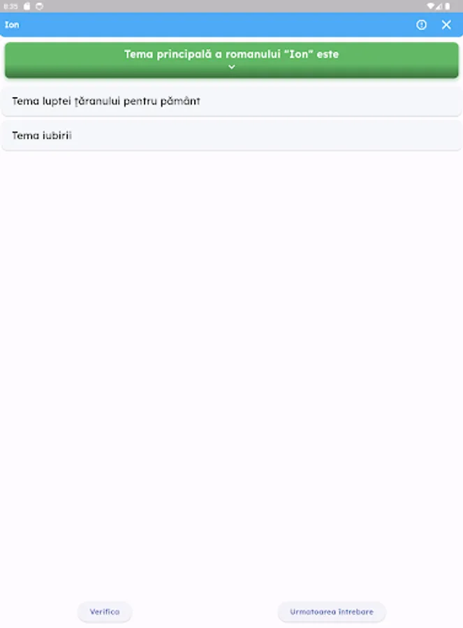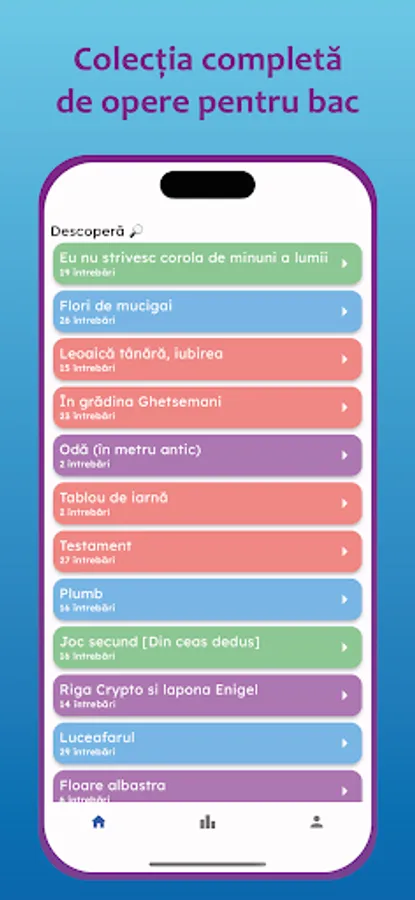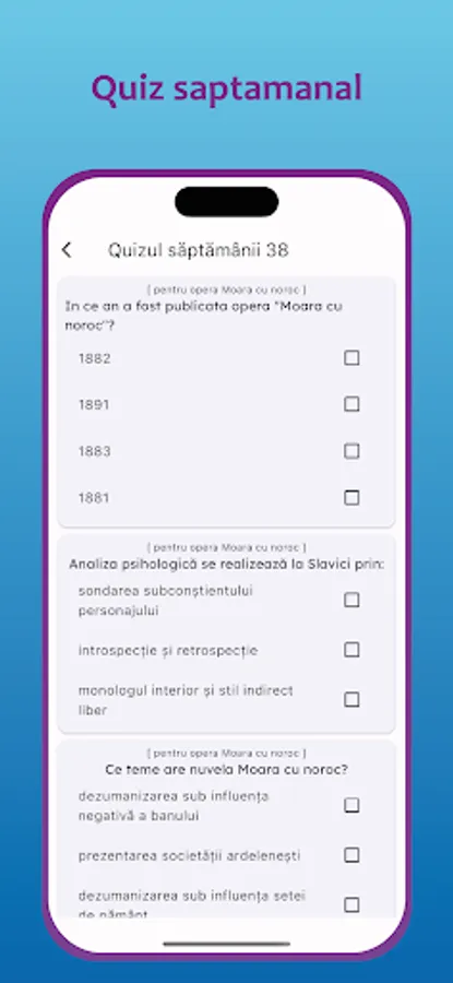 Easily learn the BAC subject for the Romanian test, in an interactive way, completing quizzes. More than 500 quizzes that will help you determine your knowledge about the works that can fail the baccalaureate, in an interactive way. With the information you learn from the questions, you will be able to create an essay with which you will get the highest grade in the exam.