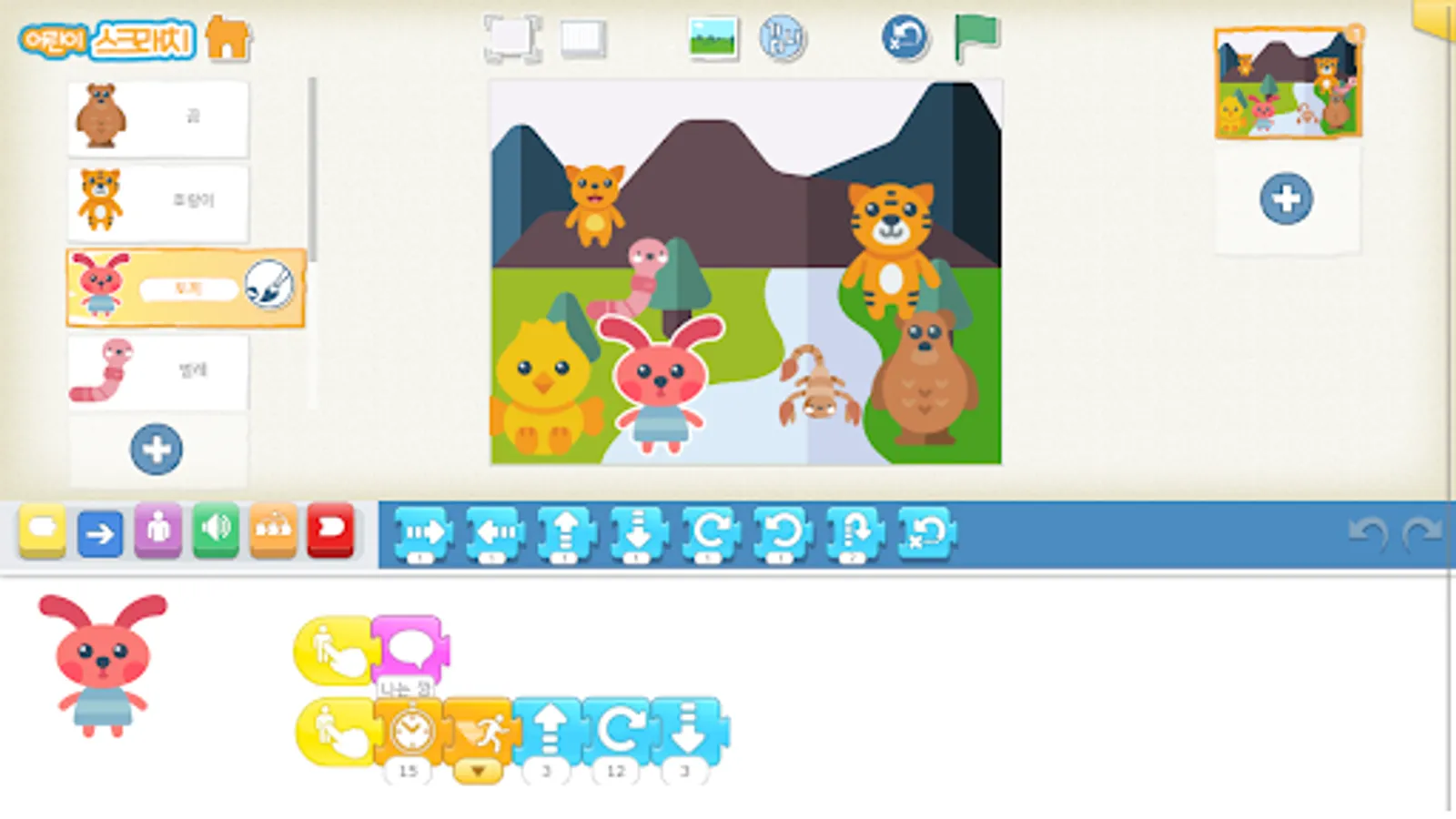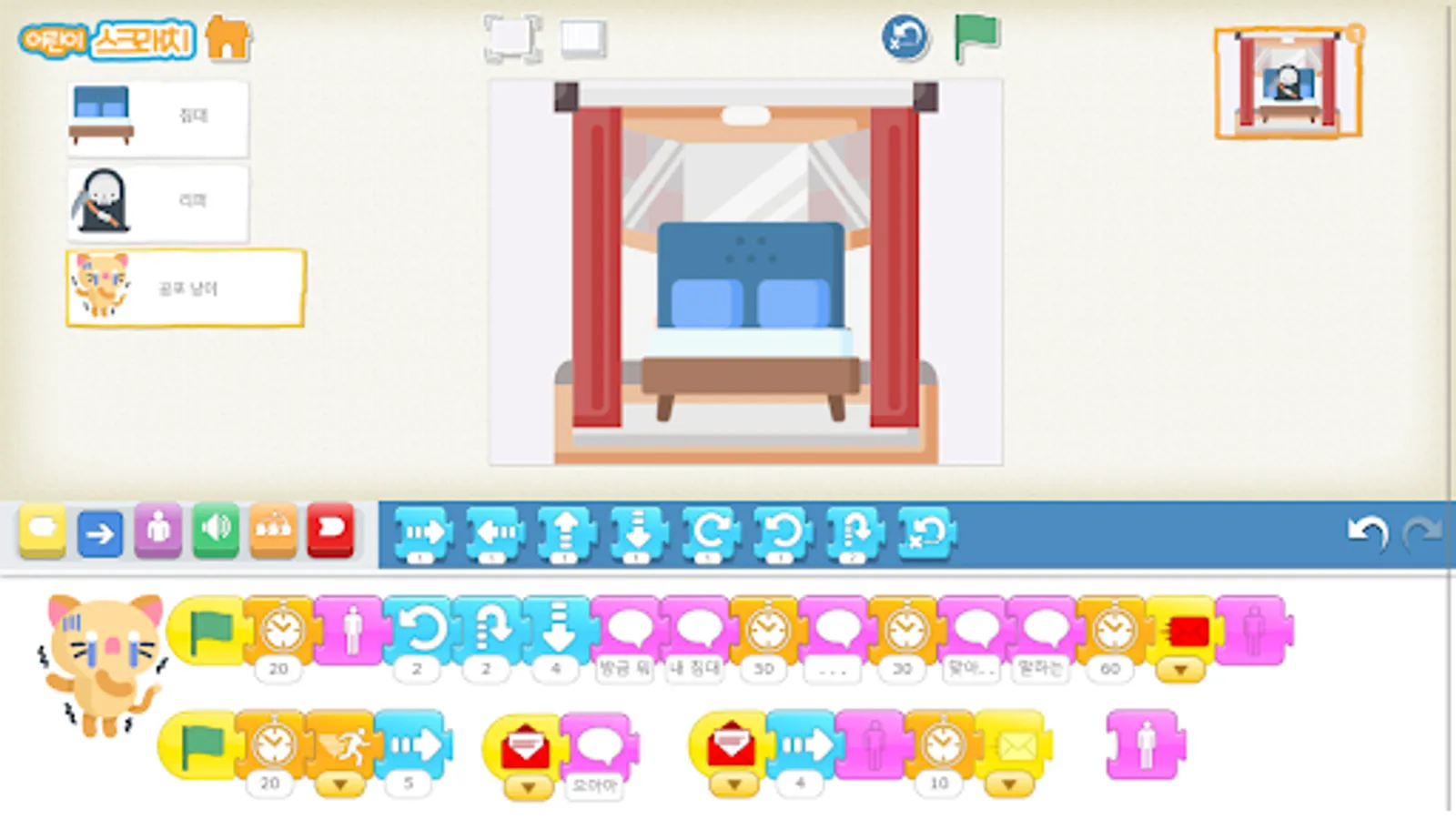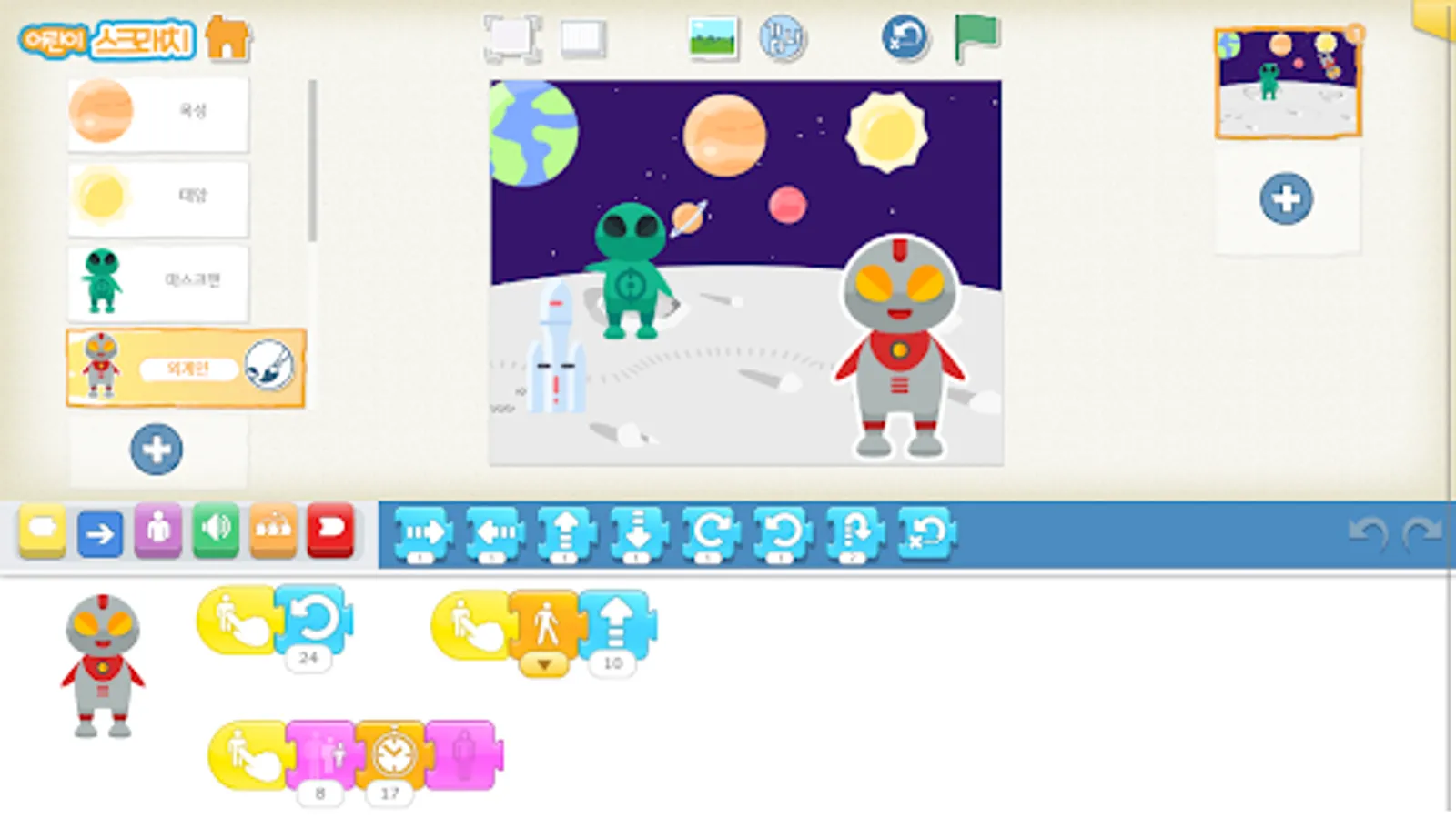 Characters and backgrounds that can be used for coding were greatly added, and It has many samples for learning based on the contents of BootUp (https://bootuppd.org/scratchjr).
