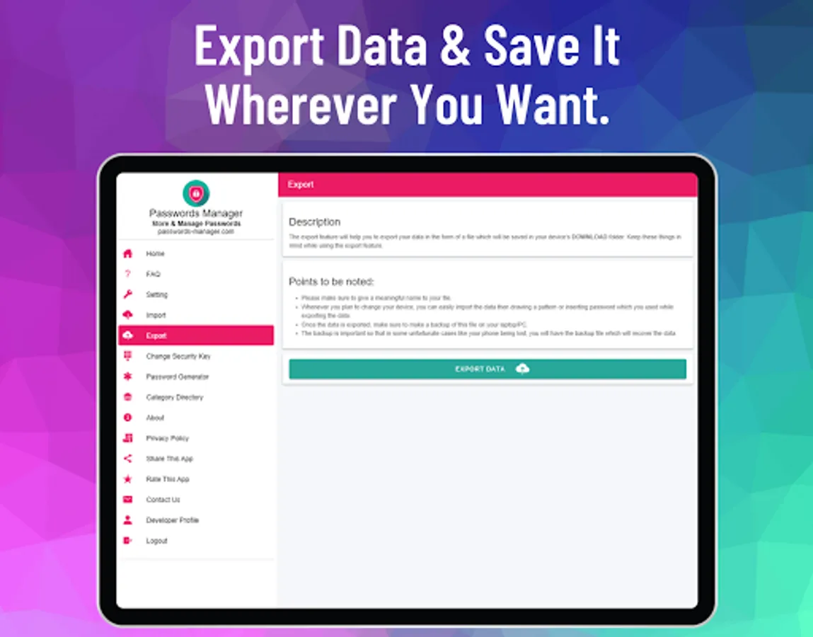 Since the Passwords Manager application operates entirely offline, transferring data to a new device requires a manual export of their data from the current device and securely stores it somewhere before uninstalling the application.