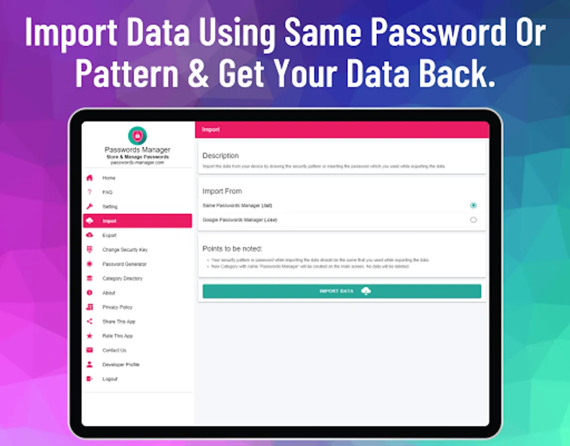 Passwords Manager allows users to effortlessly import their passwords from various file formats. Whether it's a Google CSV file, a Passwords Manager (.txt) file, or a Passwords Manager (.csv) file, the application provides the flexibility to import data from other sources.