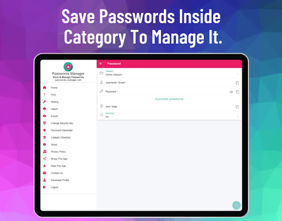 The application includes a Password Generator tool that assists users in creating highly secure passwords.