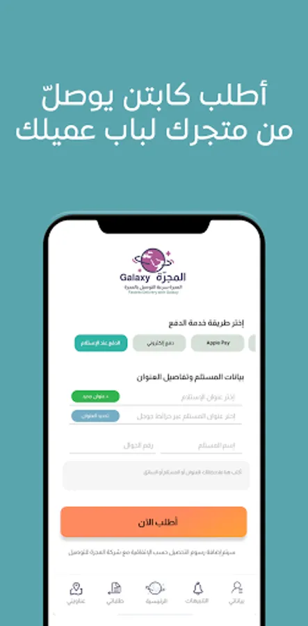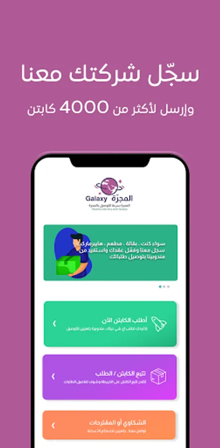 تطبيق المجرة هو تطبيق يقدم خدمات توصيل للطرود والشحنات التي يتم طلبها لحظيا ، عند تسجيلك معنا فأنت بذلك تقوم بالوصول لأكثر من 4000 كابتن مسجلين معنا رسميا ، يساعد التطبيق جميع قطاعات الأعمال التي تحتاج الى توصيل طلبات او شحنات لعملائهم ، مهما كان نوع هذا الطلب سواء كان وجبات سريعة أو ارساليات ورقية او أجهزة خفيفة ، نقوم في المجرات بتغطية احتياجات المتاجر التي لا يوجد لديها سائقين او بحاجة ماسة لزيادة اسطولها ،