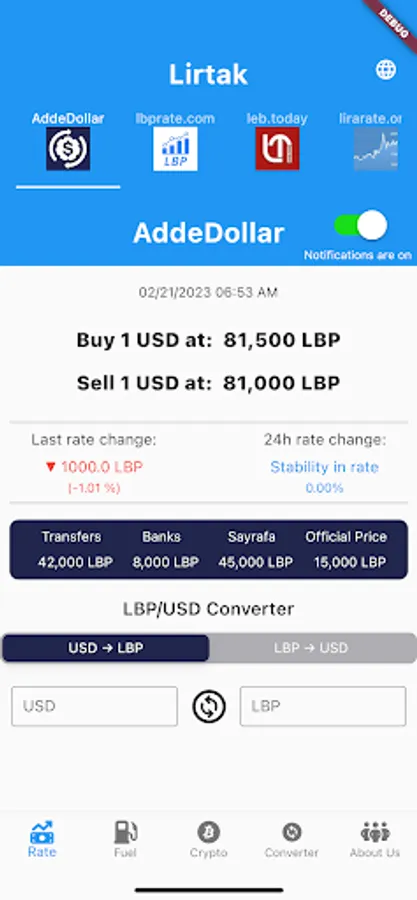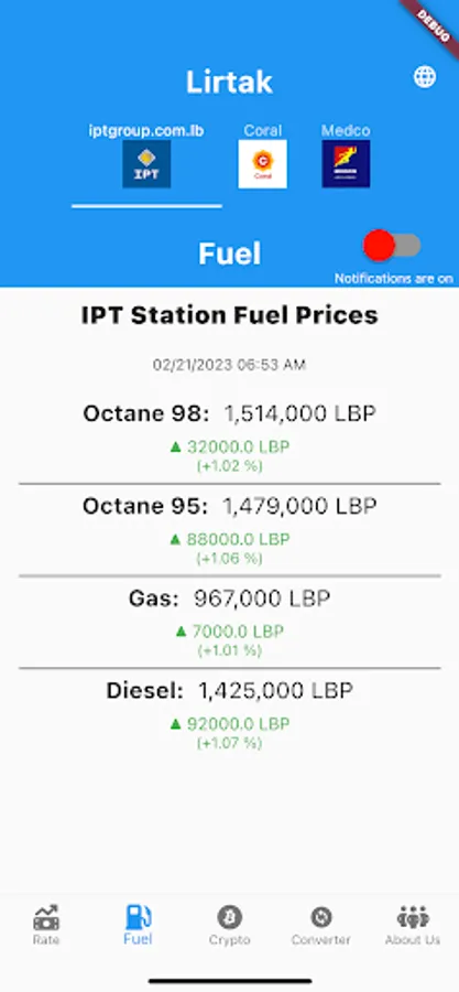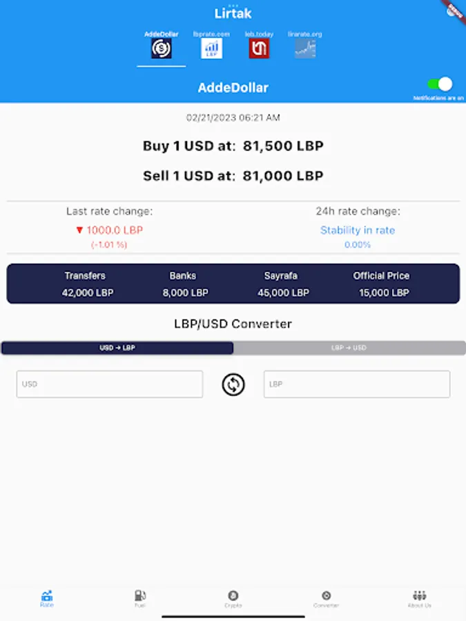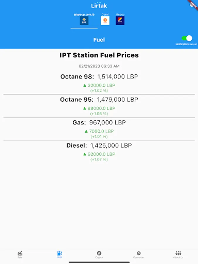 Lirtak app will help you keep track of Lebanese pound rate in black market and also to keep track of fuel prices as it goes up and down with analysis for daily changes.
