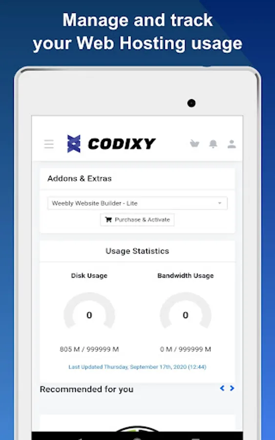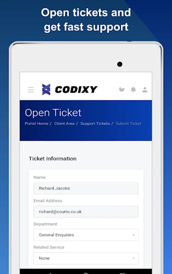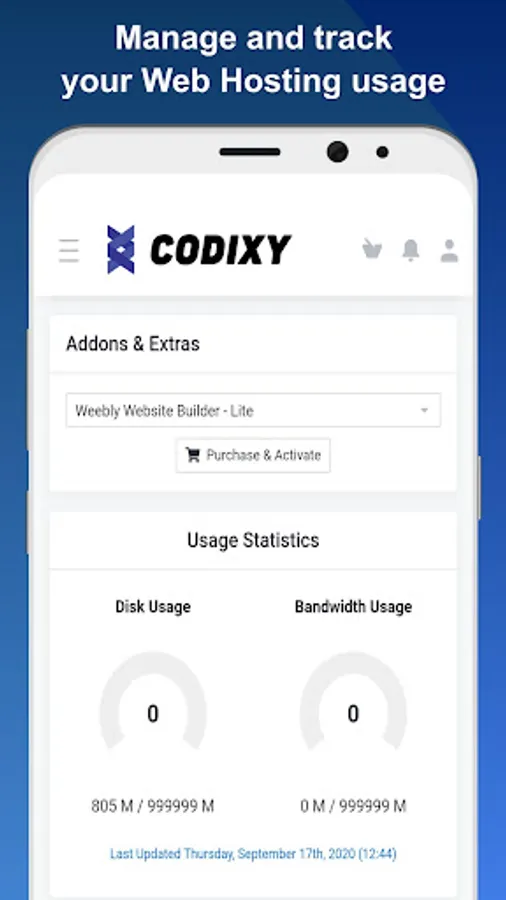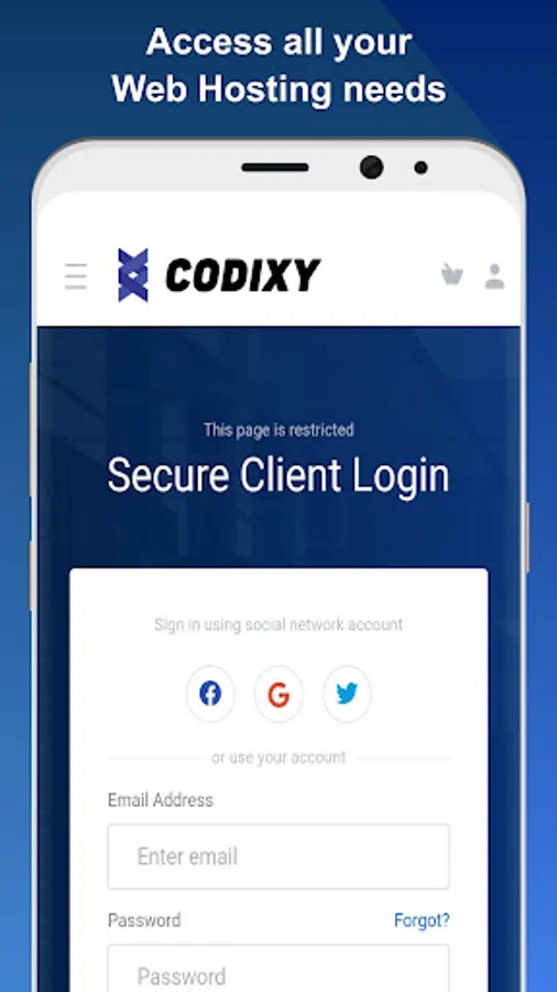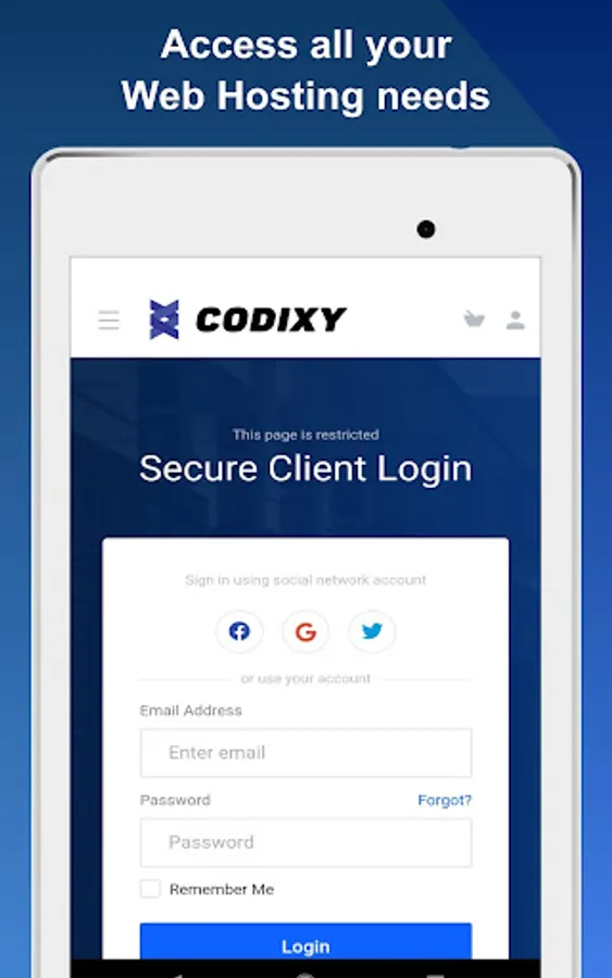 The official Codixy Client mobile app enables you to manage your Web Hosting needs, contact support, view Knowledge Bases, purchase addons and upgrades and see the server uptime.