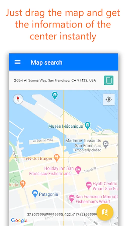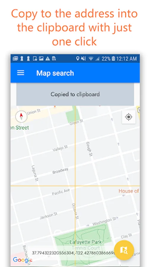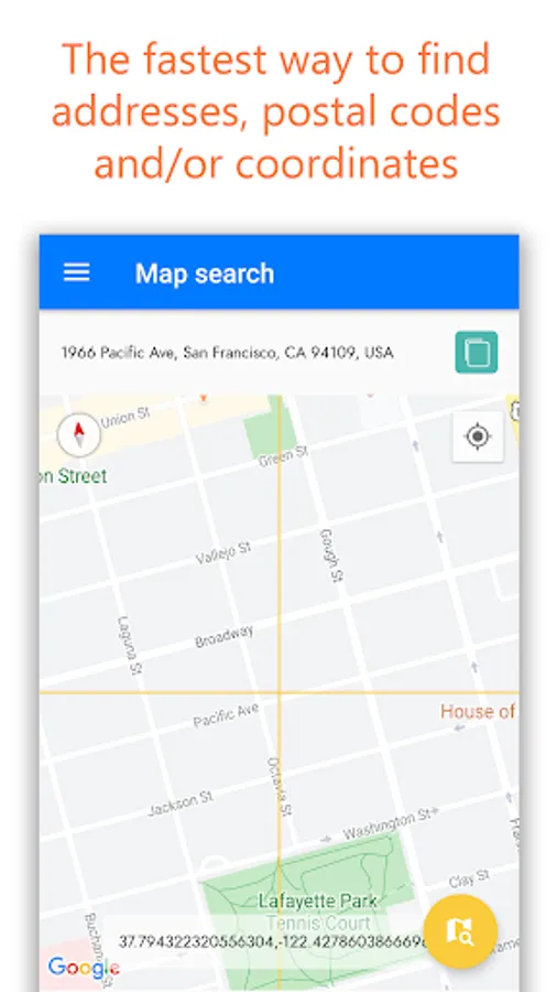 When moving or tapping the map, you'll get instantly the full address and the GPS coordinates of the new point at the center of the map. Then you can copy it to the clipboard with just one tap on the screen.