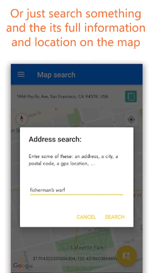 There's also a search button, so you can find addresses and coordinates (latitude and longitude) of those places you're looking for.