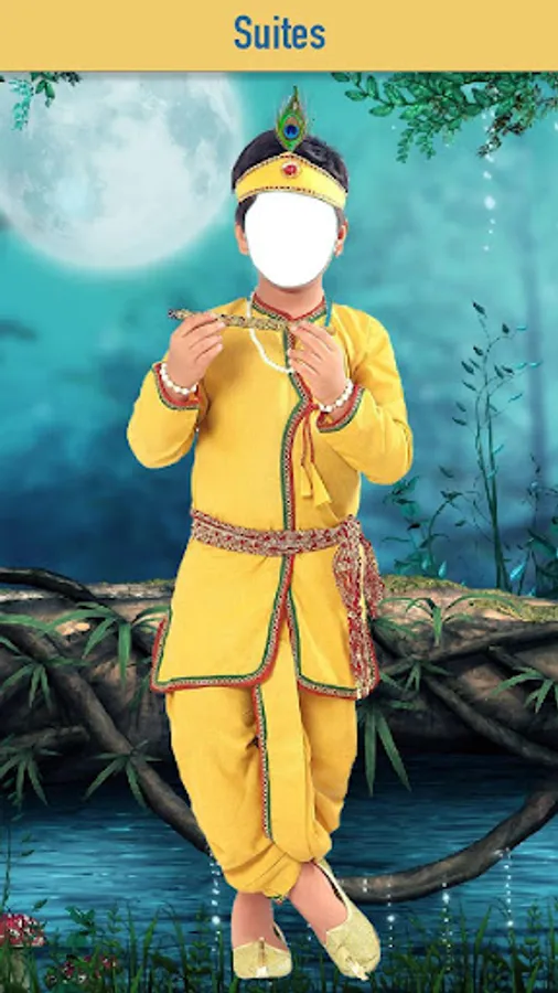Just decorate your cute little kids beautifully with turbans,flute,peacock feathers,Colorful dhotis and all with our Krishna Photo Suit Editor.
