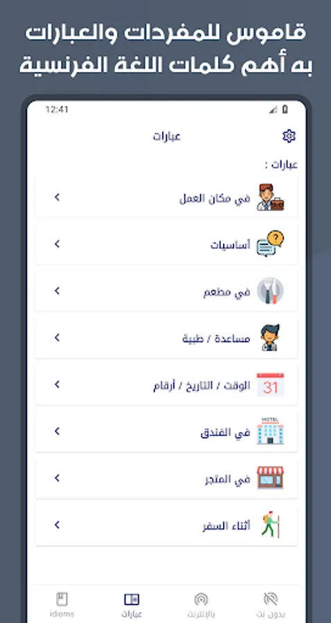 Dictionary French - Arabic & Translator, fast and practical contains lots of words and expressions. The dictionary is offline. The dictionary contains the Vocabulary Trainer. It’s an easy way to learn new words.