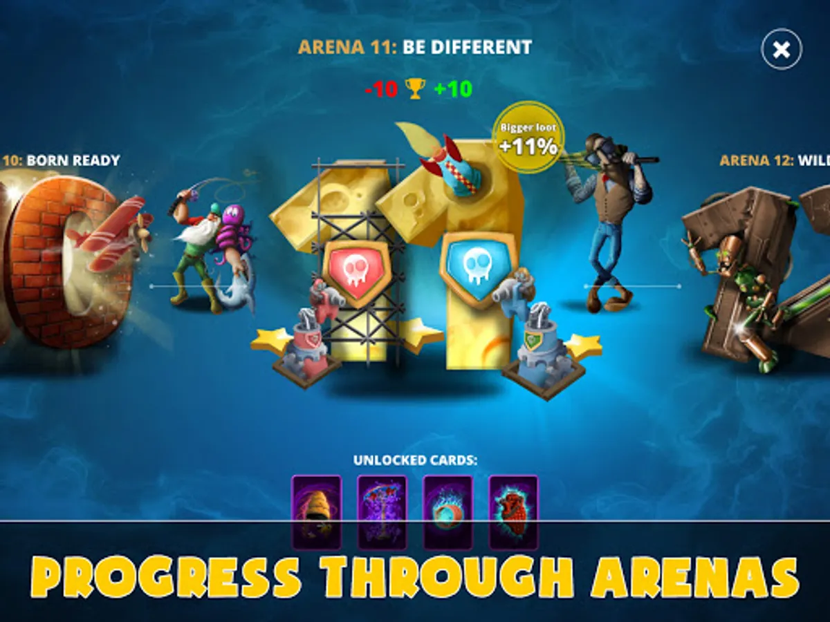 Collect and upgrade cards to reach legendary levels of your MOBA heroes’ armor, speed, and damage. Put on a deadly battler soda can ring (what?!) while a chicken breast armor (what, what?!) gives you the best defense in this PvP RPG battler.