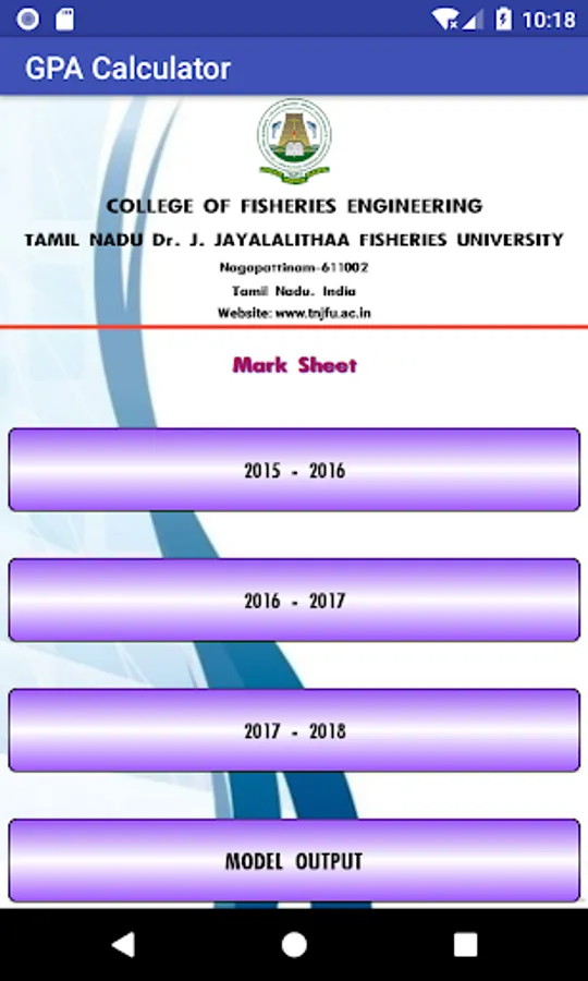 Grade point average calculator is a easy way of calculating the college course grades of each semester. This calculator will help you to calculate your over all average percentage within no minutes.This application saves times and easy for college use.This application is especially for College of Fisheries Engineering B.E.(Fisheries Engineering ) students.