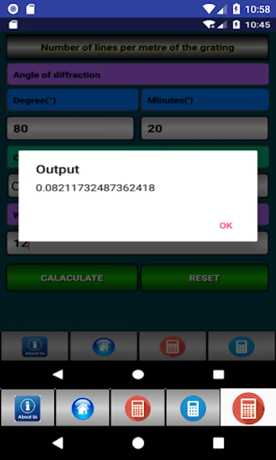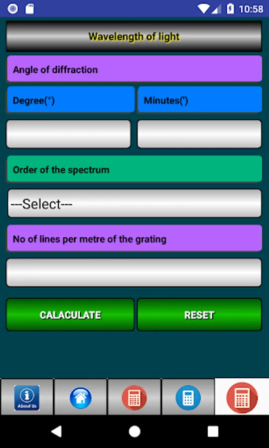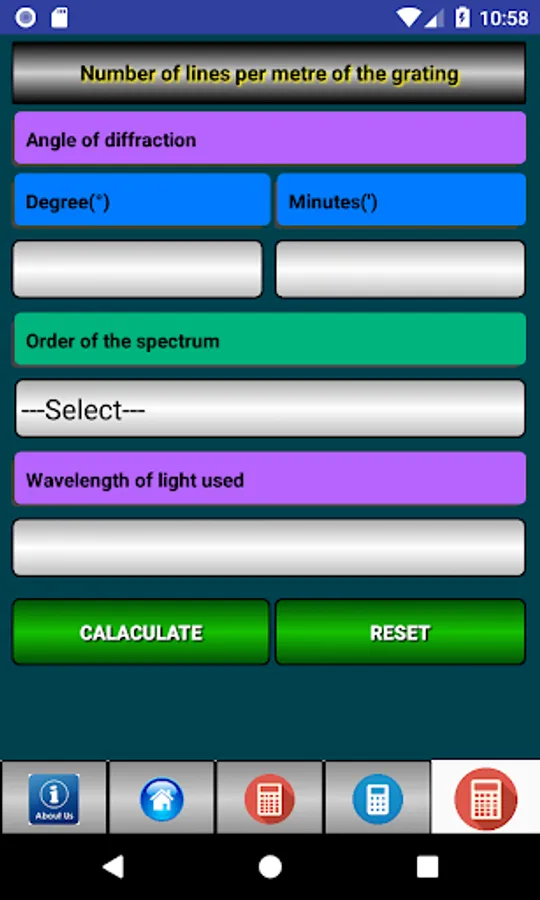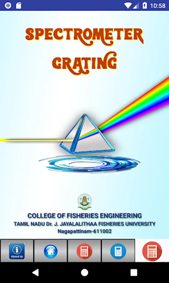 It determines the (i) number of lines per meter of the grating and (ii) the wavelengths of the prominent lines (color) of the mercury spectrum using spectrometer. These physical properties can be calculated by knowing four parameters namely number of lines per meter of the grating (N, in m), angle of diffraction (θ, in O), order of the spectrum (m) and wavelength of light used (λ, in m or nm). In that, from these parameters we can calculate the wavelength of the different wavelengths of the prominent lines of the mercury spectrum. The mobile application will be more helpful for students, researchers and scientists for laboratory students.