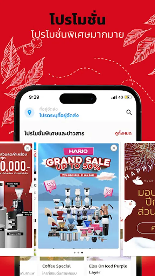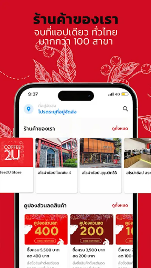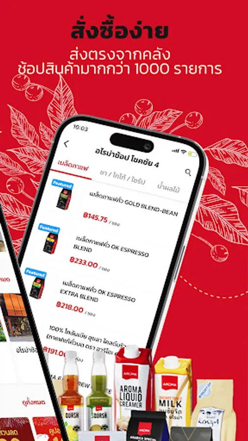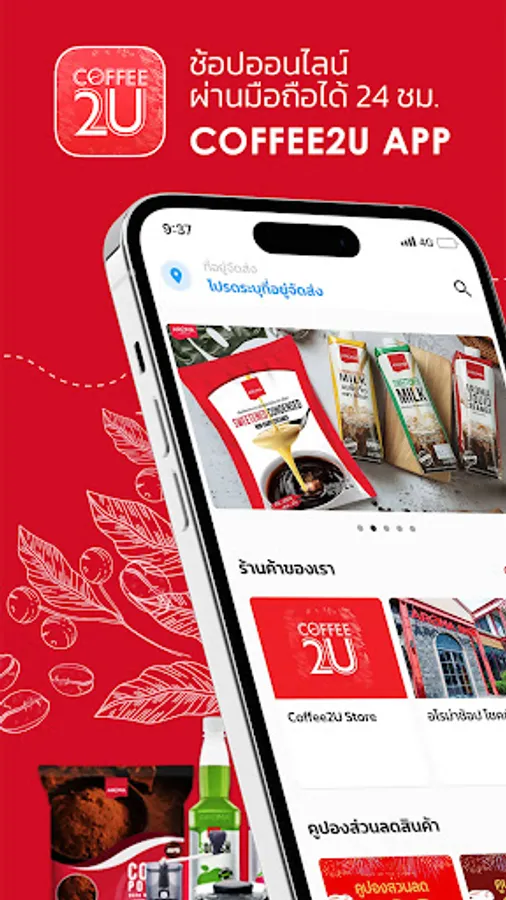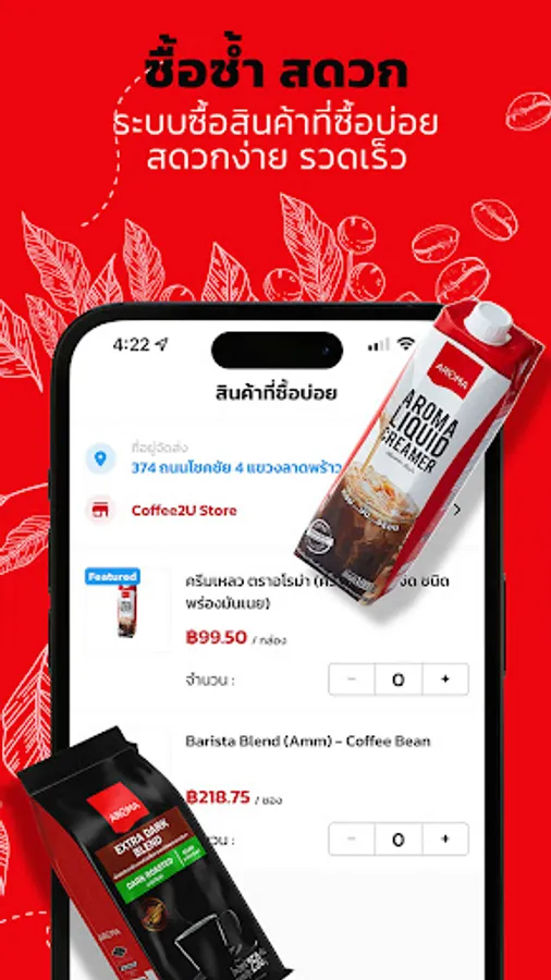 Coffee2U from Aroma Group pleases coffee shop entrepreneurs. Order a complete range of products, both retail-wholesale. There are both coffee machines. coffee grinder And raw materials Arabica coffee beans, Robusta coffee beans, cocoa, Thai tea, Matcha green tea, liquid cream, sweetened condensed milk, condensed milk. Shop all over Thailand in one app.