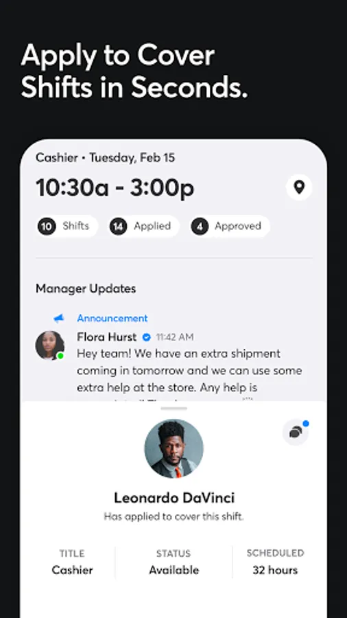 Looking to earn extra income? Pick up shifts by browsing available work opportunities on the Shift Marketplace. Tap on a shift to apply. Once you are approved, head in to work!