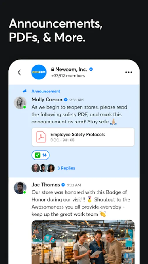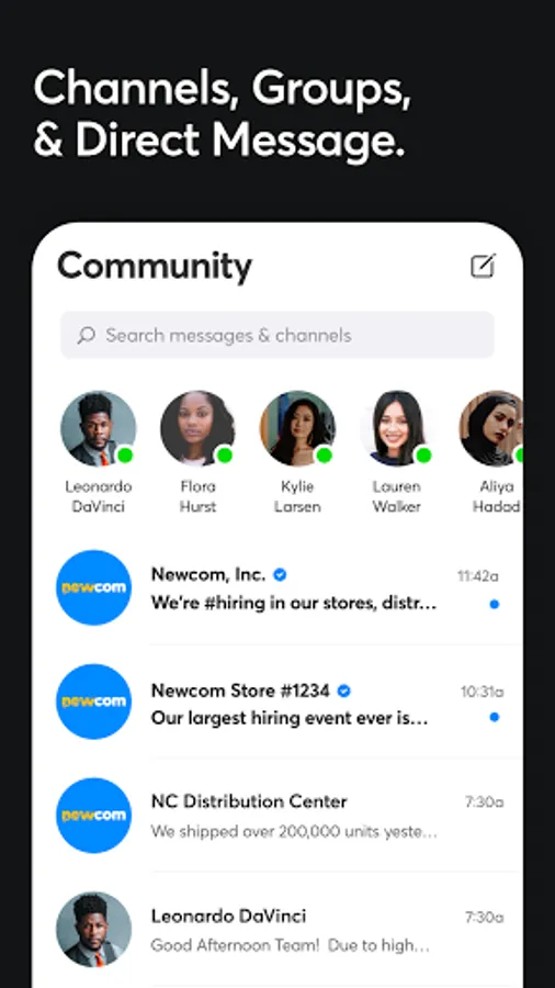 Stay connected without trading phone numbers with your coworkers. Access the Community tab to send direct messages or post multimedia on team channels.