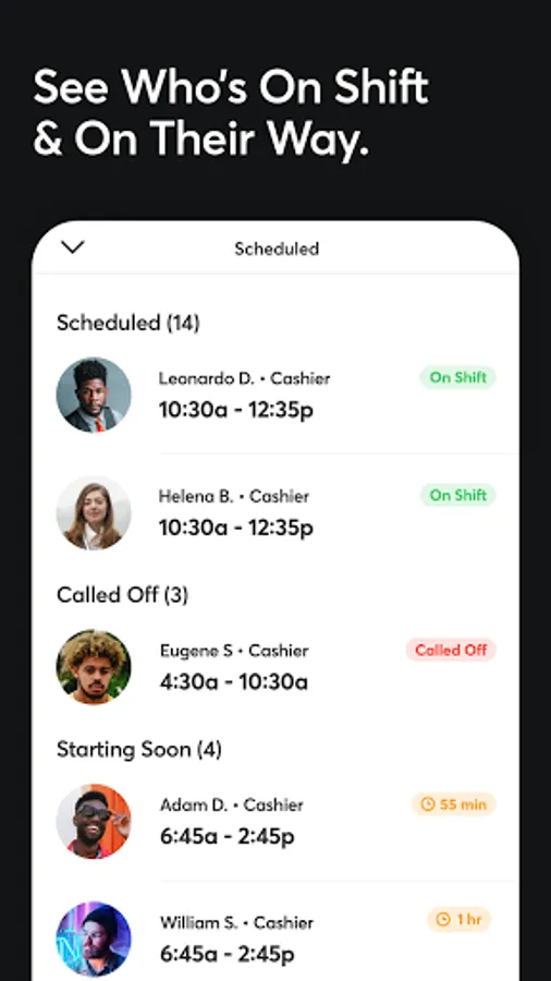 Access and manage your work schedule on your mobile device. View shifts you are working, all shift details, and get push notification reminders before each shift.