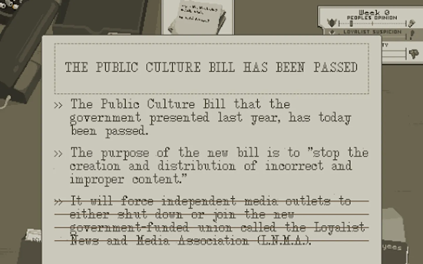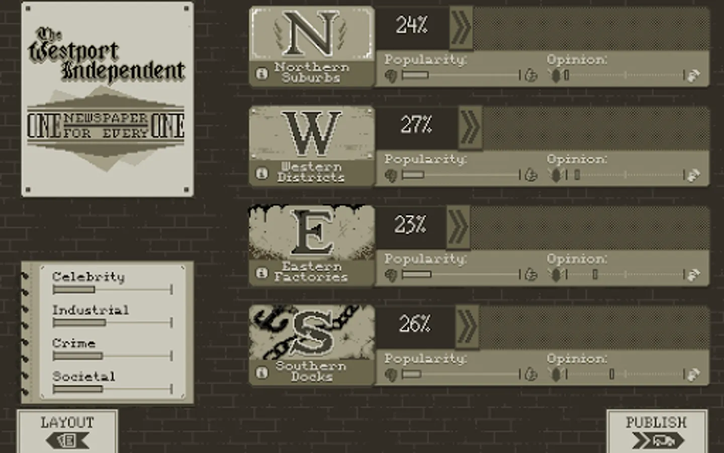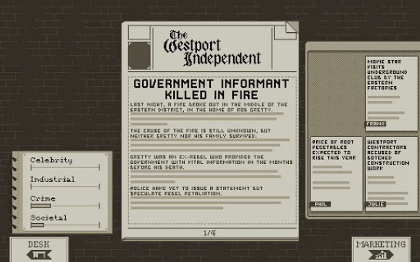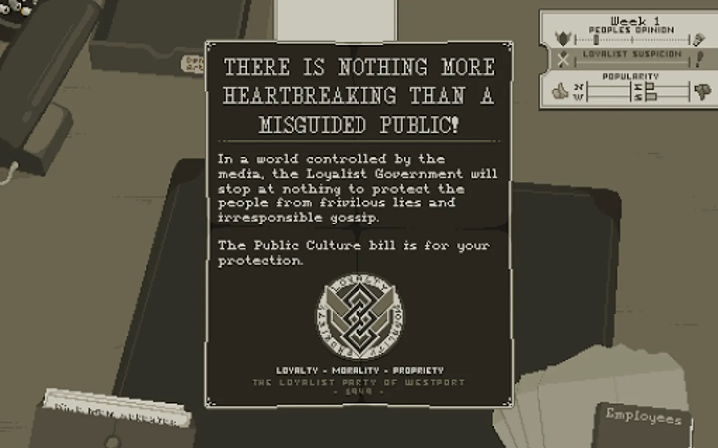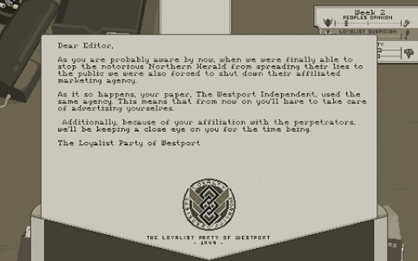 The Westport Independent is a censorship simulator taking place in a post-war country, governed by the recently elected Loyalist Party. As the editor of one of the last independent newspapers in the country, your job is to remove and edit the content of your paper, affecting the people’s opinion of both the rebels and the Loyalist government. With an increase of rebel activity and an ever watching government breathing down your neck, whose truth will you print?