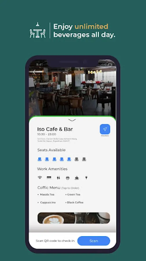 Upon purchasing the plan, you have the flexibility to book your Co-working space for the day. Login to the application and find a workspace near your location. Visit the café, check in by scanning the QR code and start your work for the day. During your working hours, you have access to high speed internet, unlimited tea or coffee and the company of numerous like-minded people. Manage your bookings and review your past bookings and rate your experience.