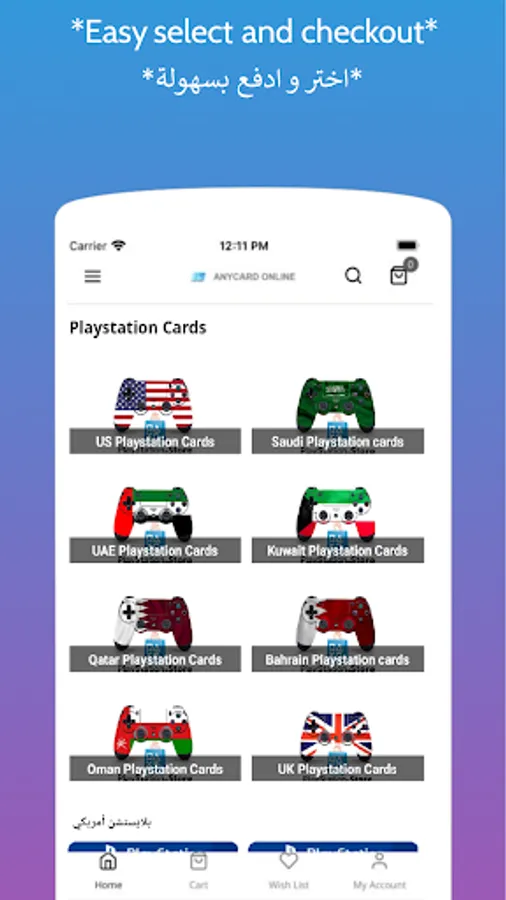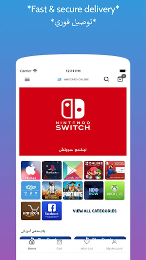 AnyCard is characterized by the ease of use, fast delivery and diversity of the products for Playstation (American, UAE, Saudi, Qatari, Kuwaiti, Bahraini, Omani) Xbox and Nintendo. Anycard offers multiple payment methods like Visa, Master, Paypal, KNET, SADAD and more.