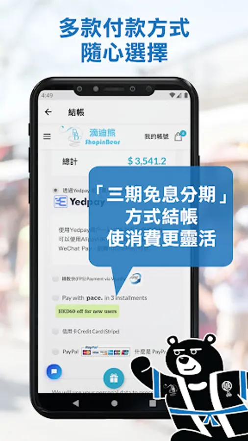 - PACE. "Three Interest-Free Instalments" payment method (PACE. New members can enjoy HK$60 rebate upon checkout over HK$300)