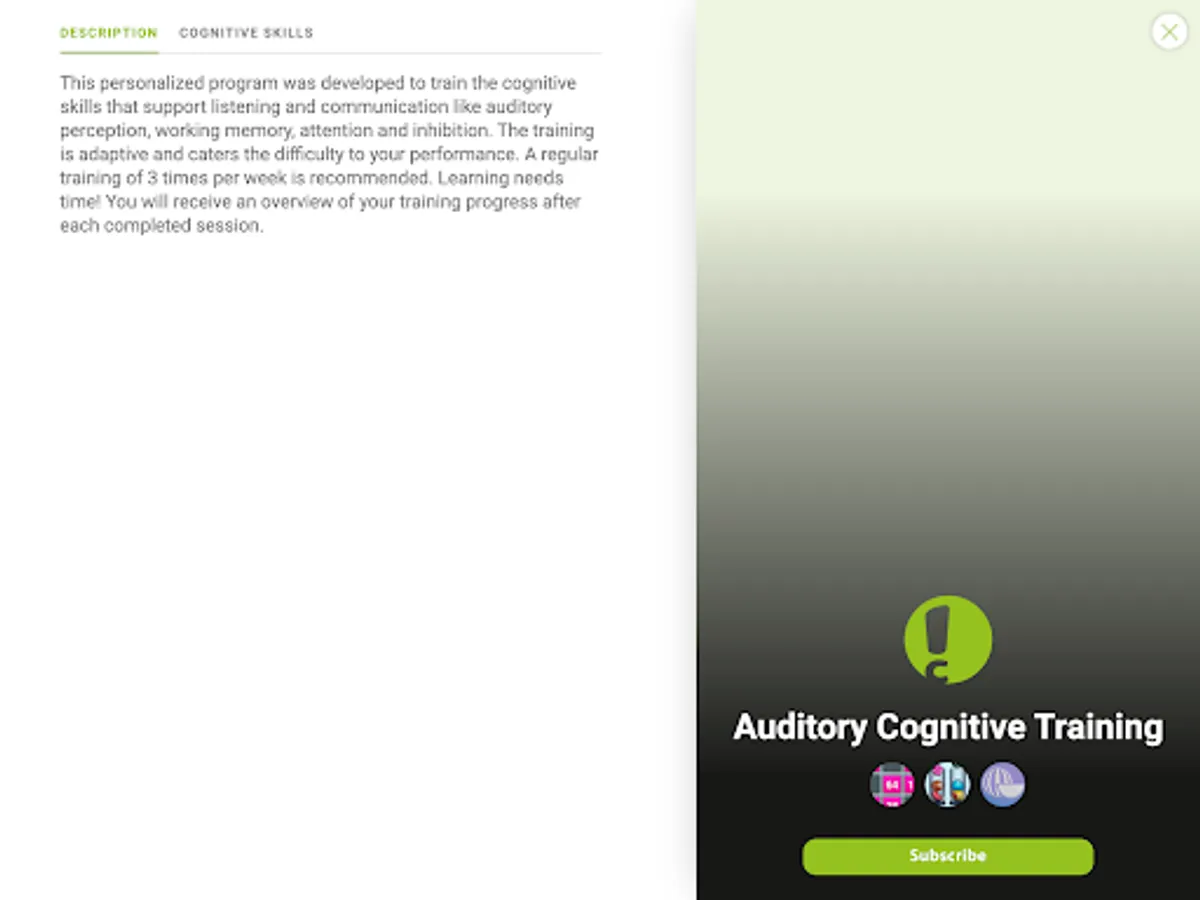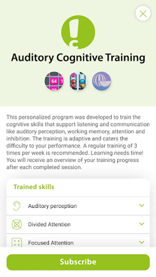 Welcome to ACT! from Connect Hearing – powered by CogniFit. ACT! provides an auditory-cognitive training program that focuses on the cognitive skills that support your listening and communication. The program contains more than 15 games that train your auditory perception, working memory, attention, and inhibition. The training is personalized and adapts the difficulty to your individual performance. You will get regular feedback on your progress.