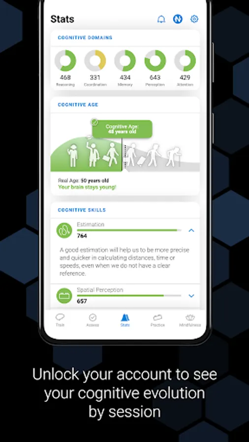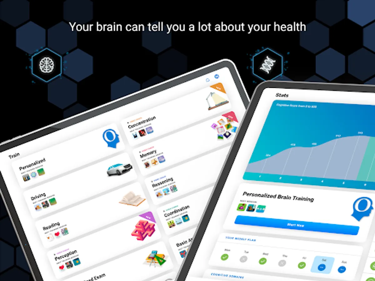 Monitor your daily and weekly cognitive score stats. Set a goal for yourself to increase the score through multiple brain training sessions. Develop a plan of action to train and practice as often as you'd like. Conveniently keep track of your brain health, including an estimation of your cognitive age. You'll even see a list of cognitive domains to show you which ones you excel in the most.