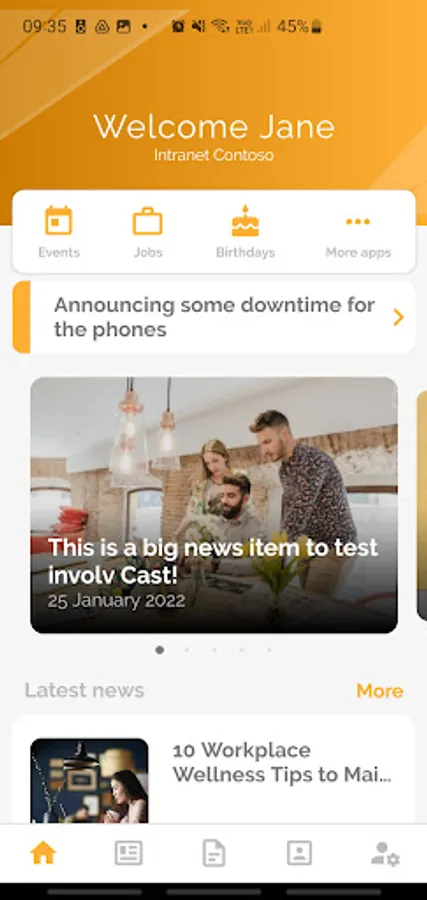 Through the More tab you get access to your specific app configured links in your Intranet solution. Enable push notifications to get