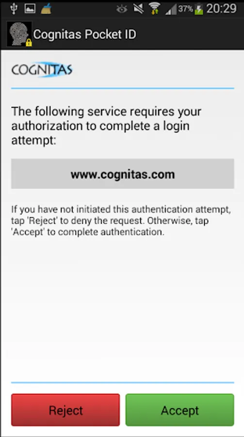 Cognitas PocketID is a two-factor authentication solution that leverages user mobile devices as the second factor. Unlike hard or soft tokens, though, there is no token copying. The second factor becomes the device itself, along with a user confirmation or rejection of an authentication attempt.
