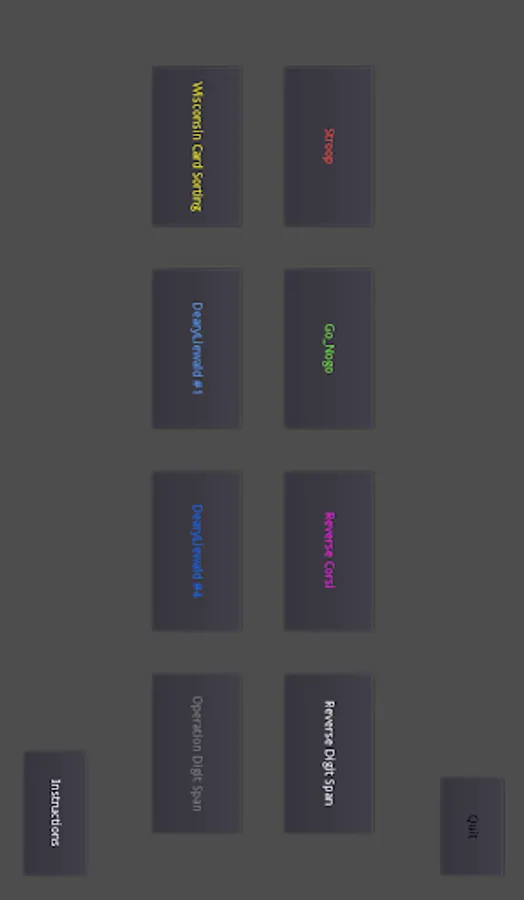 Test Battery for the study of human cognitive training. This app includes 7 different cognitive tests; Stroop, Go-Nogo, Reverse Corsi, Reverse Digit Span, Wisconsin Card Sorting, Deary Liewald (1 & 4) and Operations Span.