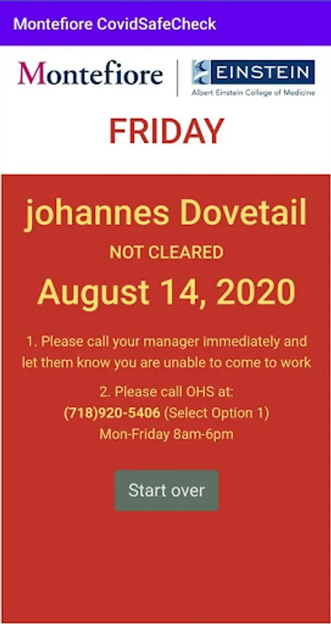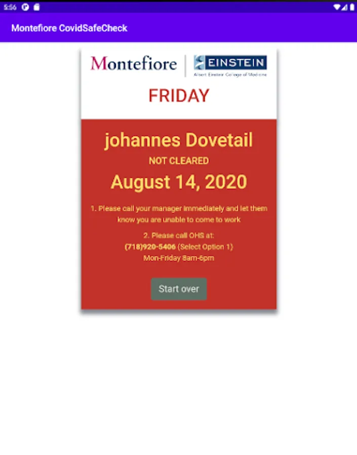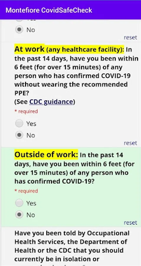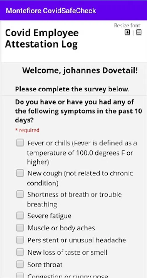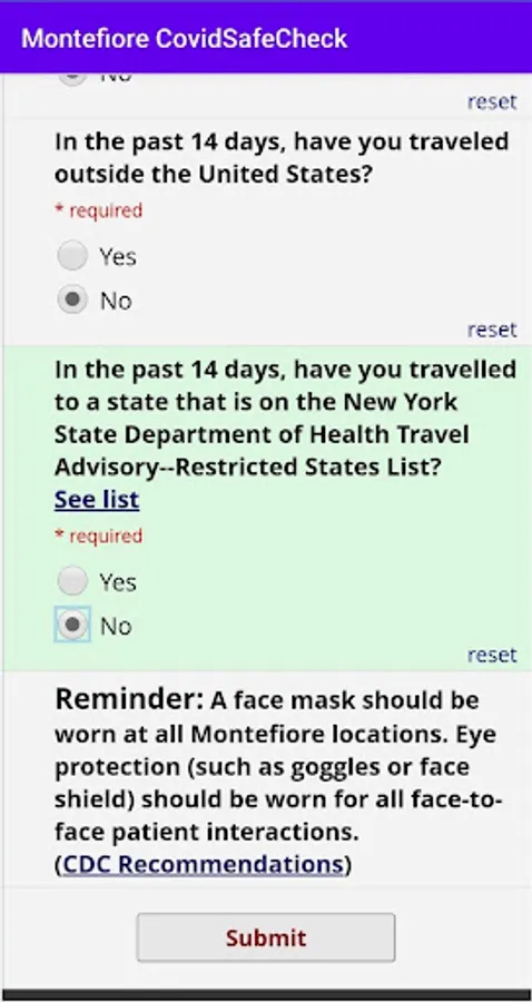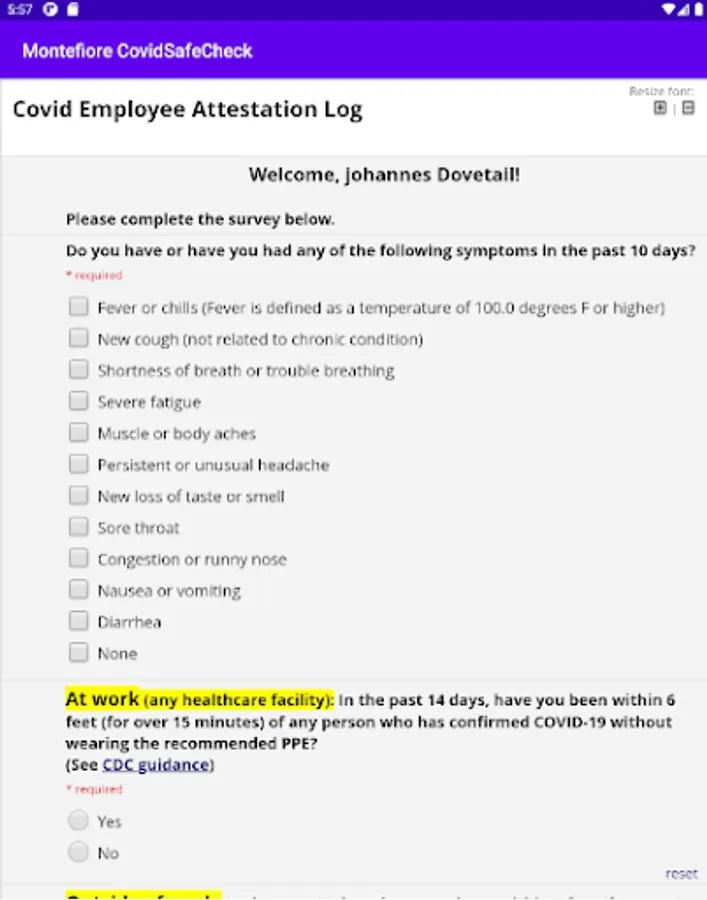 The app supports domestic visitors, international visitors, employees and vendors visiting Montefiore health system to check for safety and compliance to report in accordance with CDC regulations and Occupational Health Policies.