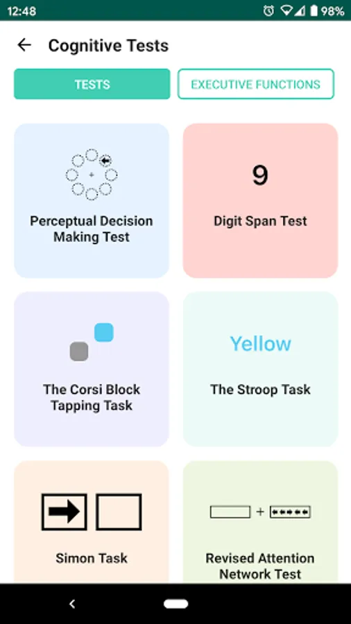 Cognition is an extra feature for users to test their cognitive function. The users can choose between different tests and executive functions to test. Users can see statistics (average and best scores as well as reaction times) for each test and executive function.
