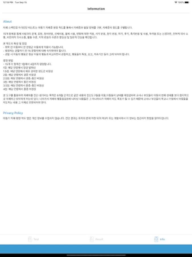 All content provided by the Autism Spectrum Self-Test is intended to provide users with easy-to-use and informative guidelines and cannot be used to replace a doctor's treatment or prescription. For all medical advice, be sure to contact your doctor or medical institution.