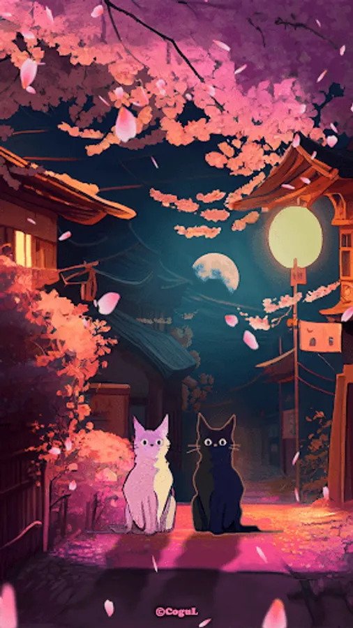 카카오톡 테마 - 벚꽃이 핀 밤과 검은 고양이 icon