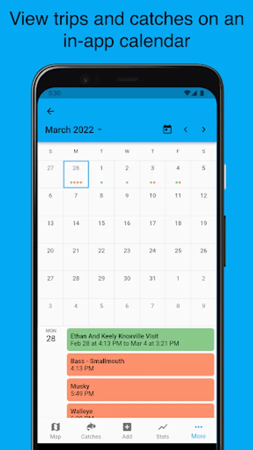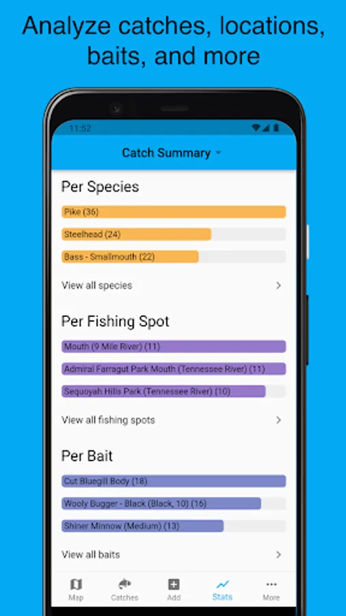 Anglers' Log is a customizable utility app that allows users to track, analyze, and share their catches in the sport of fishing. Manage your own catches, species, locations, baits, and more! Share your trophy catches using your favourite social media site, and analyze your success with the detailed statistics feature.