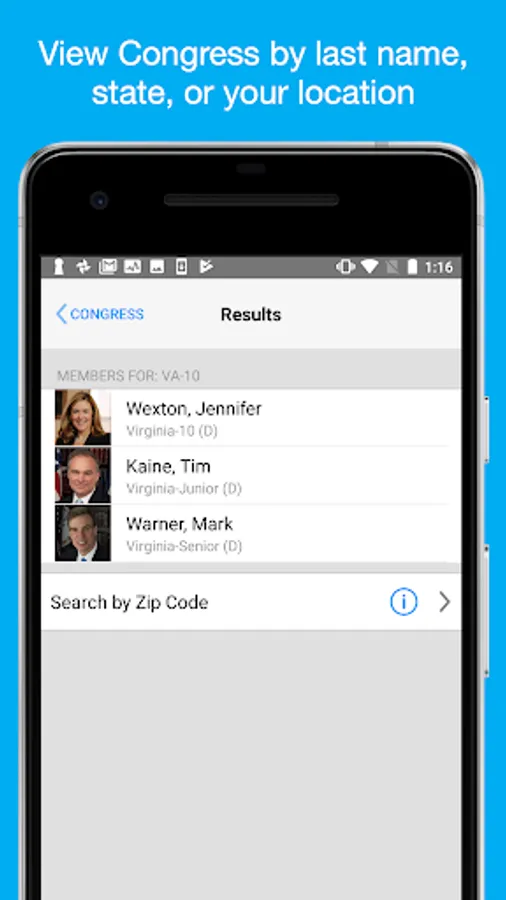 This application offers several ways to view the directory: In addition to a powerful Search function, you can see members of Congress, the House of Representatives, or the Senate by last name or state/district. Scroll lists of Senate and House Committees and Subcommittees, as well as Freshmen and Open Seats in the 116th Congress.