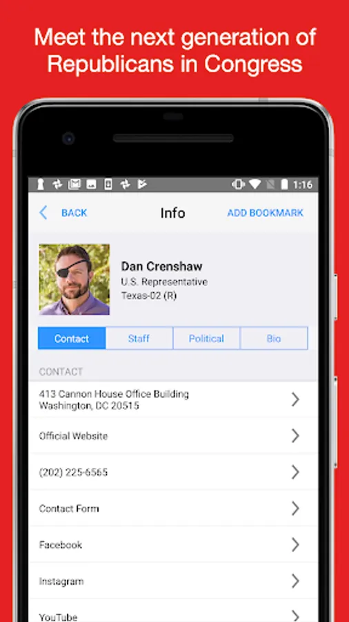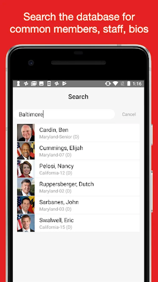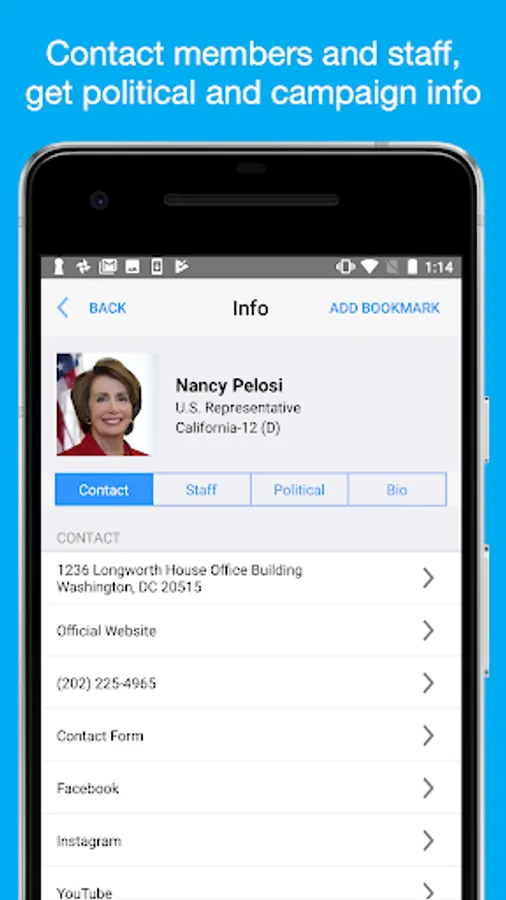For each member of Congress, this app offers a thumbnail and high-resolution photo, contact information, district maps, a short bio, social media links, capitol staff names and email addresses, legislative information, committee assignments, campaign information and ratings from the Cook Political Report, Rothenberg & Gonzales Political Report, and Sabato's Crystal Ball.