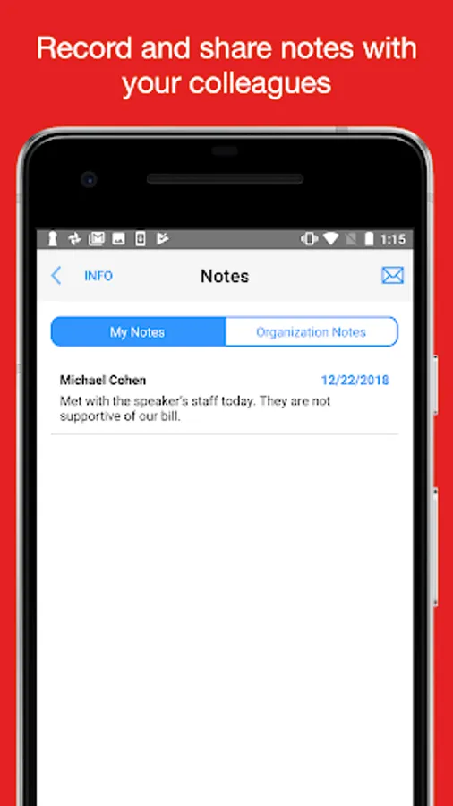 Always be prepared to talk with a member of Congress or their staff with the ability to read previous meeting notes from your colleagues. You will be able to add/edit/delete your notes and download all of them for use in logging meetings, client briefing documents, or other organizational software.