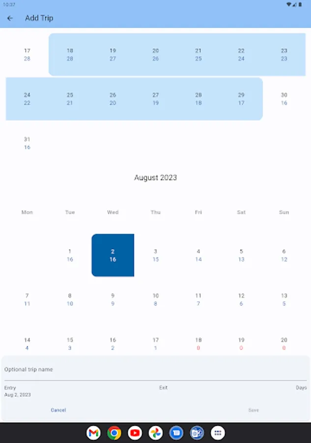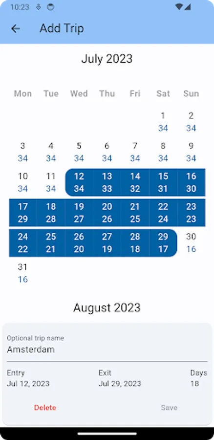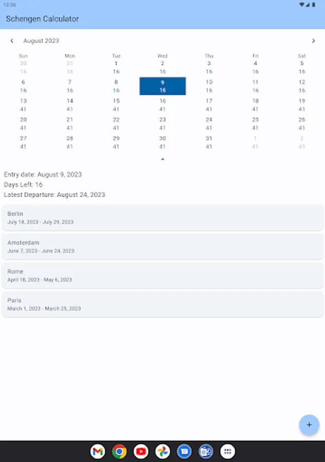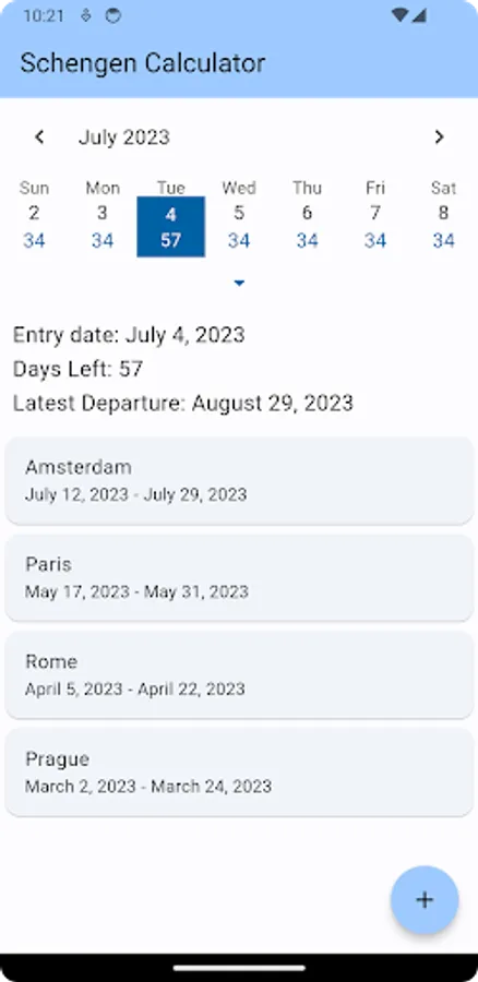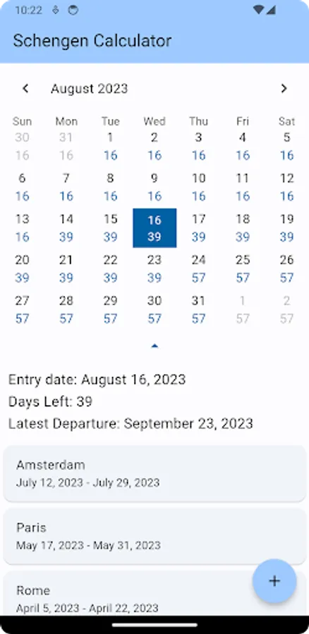 Convenient tool for planning trips to the Schengen Area and follow 90/180 days rule. Built-in calendar shows remaining days for every date allowing you to select best entry and exit dates.