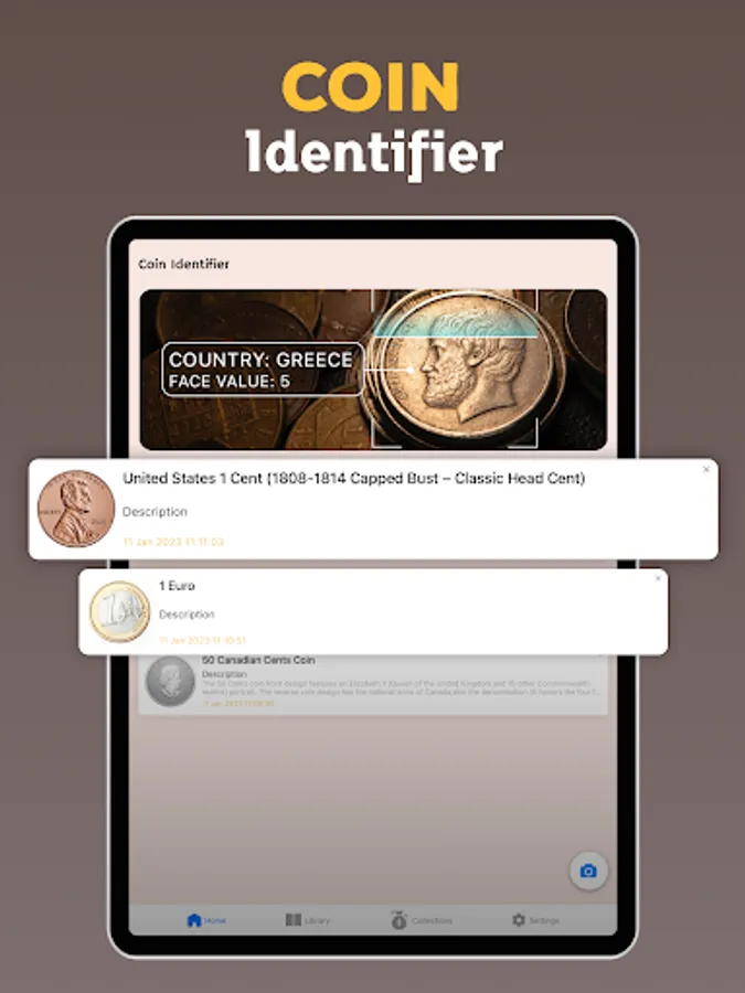 Coin Identifier Coin Scanner is a powerful mobile application that utilizes AI-driven image recognition technology to accurately identify any coin within seconds! The identification process is relatively straightforward. TAKE A PICTURE TO IDENTIFY ANY COIN TYPE ACCURATELY WITH NUMISMATIC SPECIFICATIONS, COUNTRIES SUPPORTED, PRICING DETAILS AND HISTORY INFO. Make you a pro coin collector and it's much more than a coin! Coin Identifier Coin Scanner app help you identify coins with just a snap.