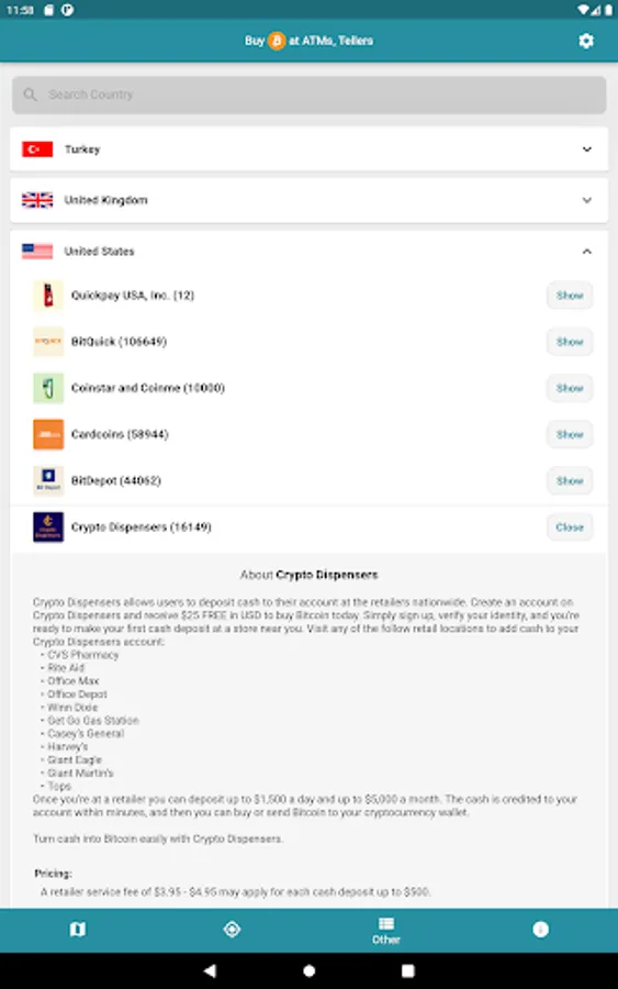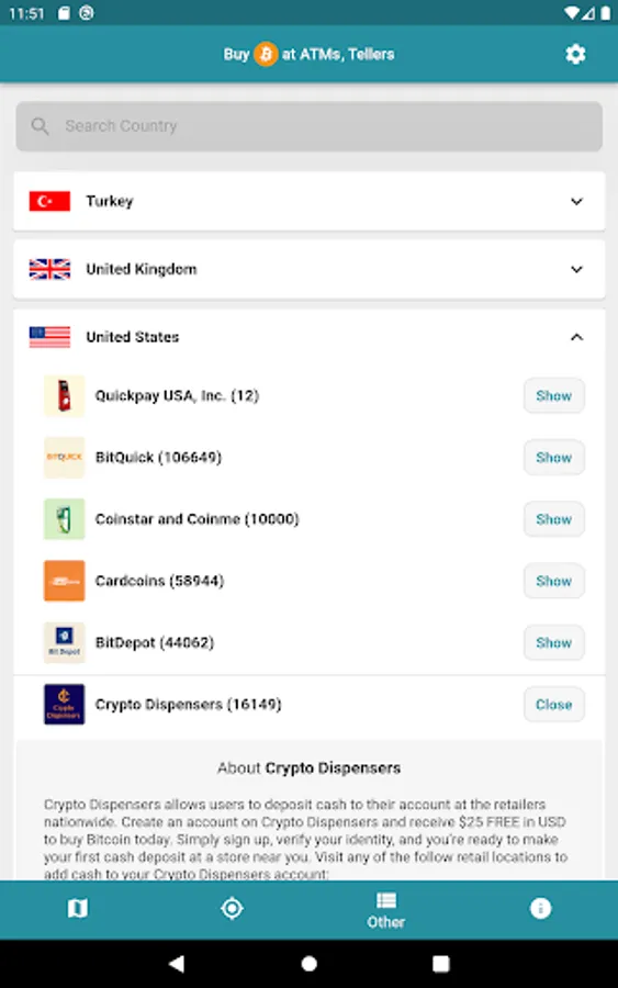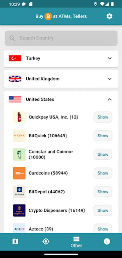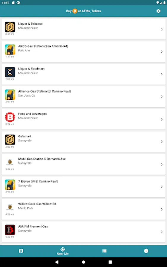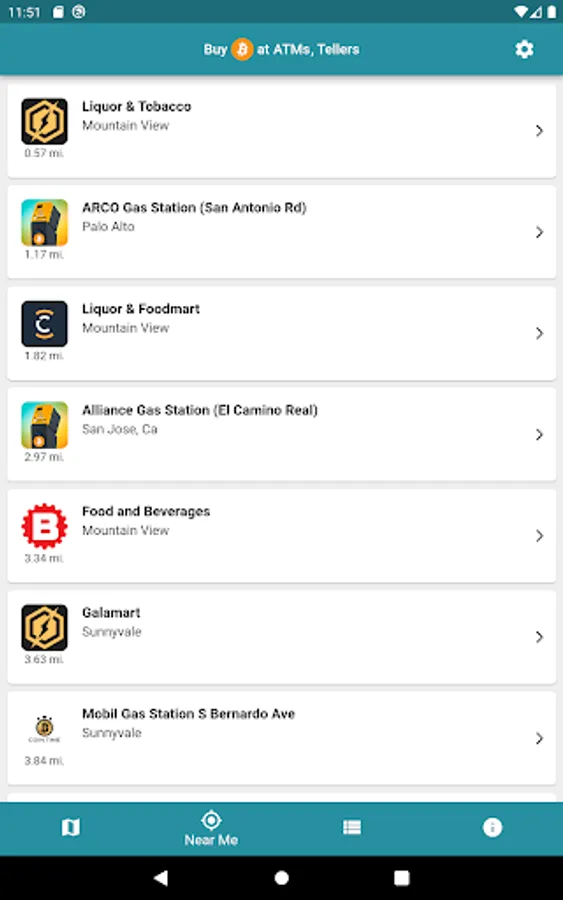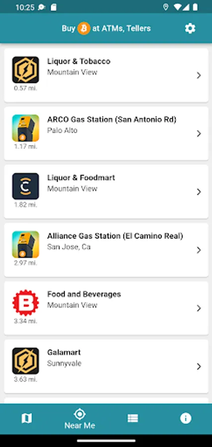 - Near me list: shows list of 20 closest ATMs and Tellers (where to buy or sell crypto for cash)
