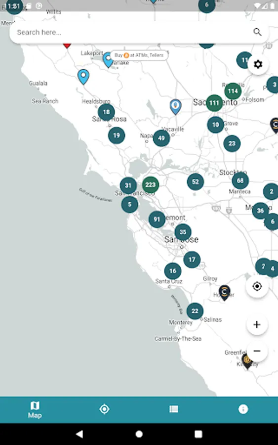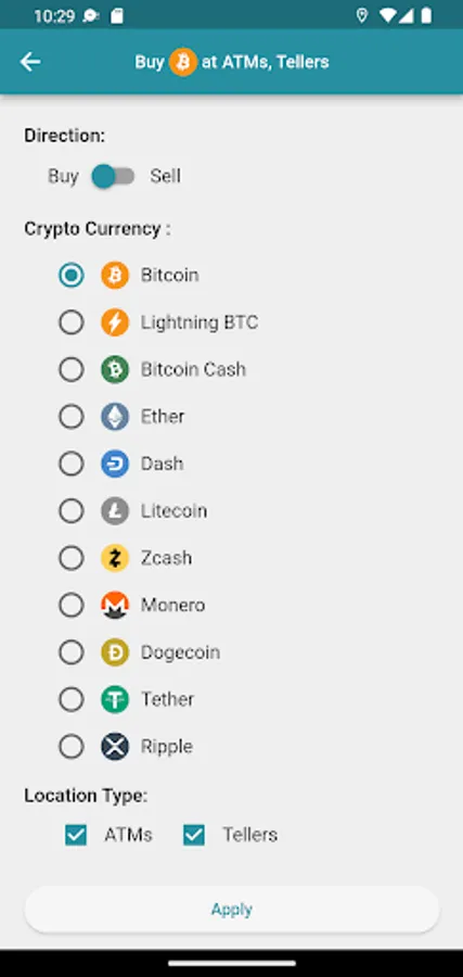 App allows to search for ATM, Teller and Other services. You can filter and display locations by coin or by transaction type (buy or sell).