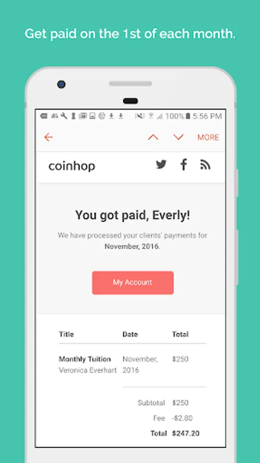 No more chasing down late payments or cashing checks from 30 different clients. Coinhop sends your clients' payments directly to your bank account on a monthly, weekly, or biweekly schedule for just 1% + $0.30 per transaction.