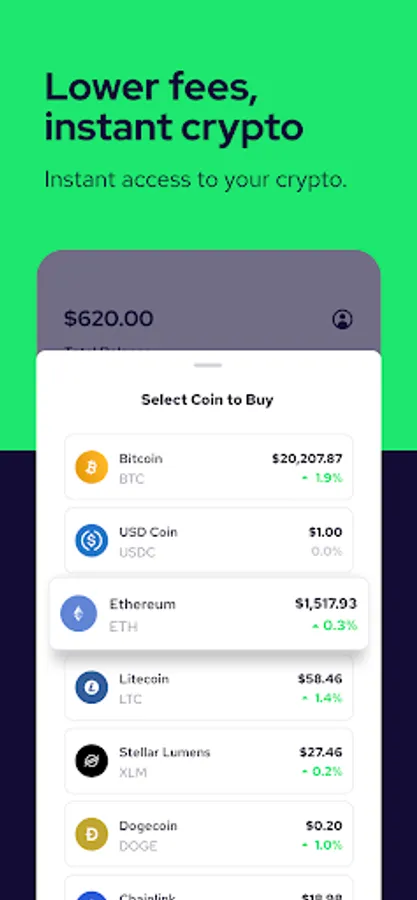 Bitcoin (BTC), Ethereum (ETH), Litecoin (LTC), Polygon (MATIC), Chainlink (LINK), Dogecoin (DOGE), Stellar Lumens (XLM), and USDC.